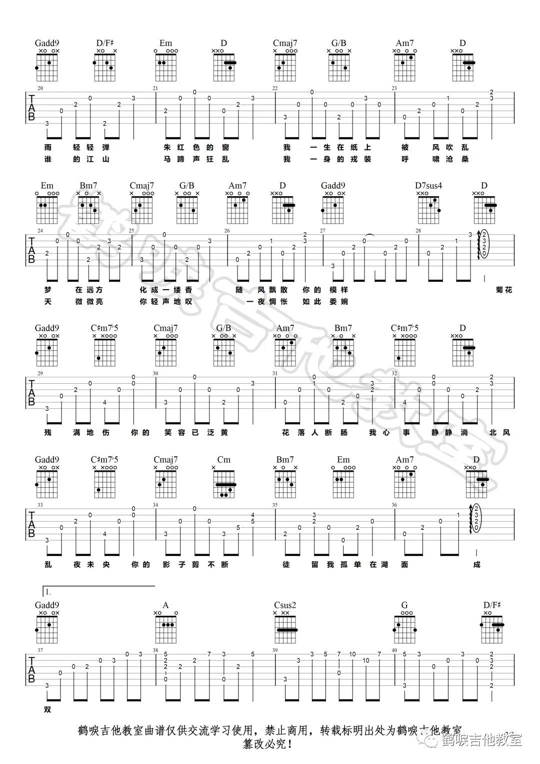 《周杰伦《菊花台吉他谱》(G调)》内容来自于互联网,不能保证内容的准确性与完整性,仅供学习交流欣赏,请勿用于其它用途,内容版权归原作者及来源网站所有,如有侵犯到您的权益请来信告知,我们将及时删除。