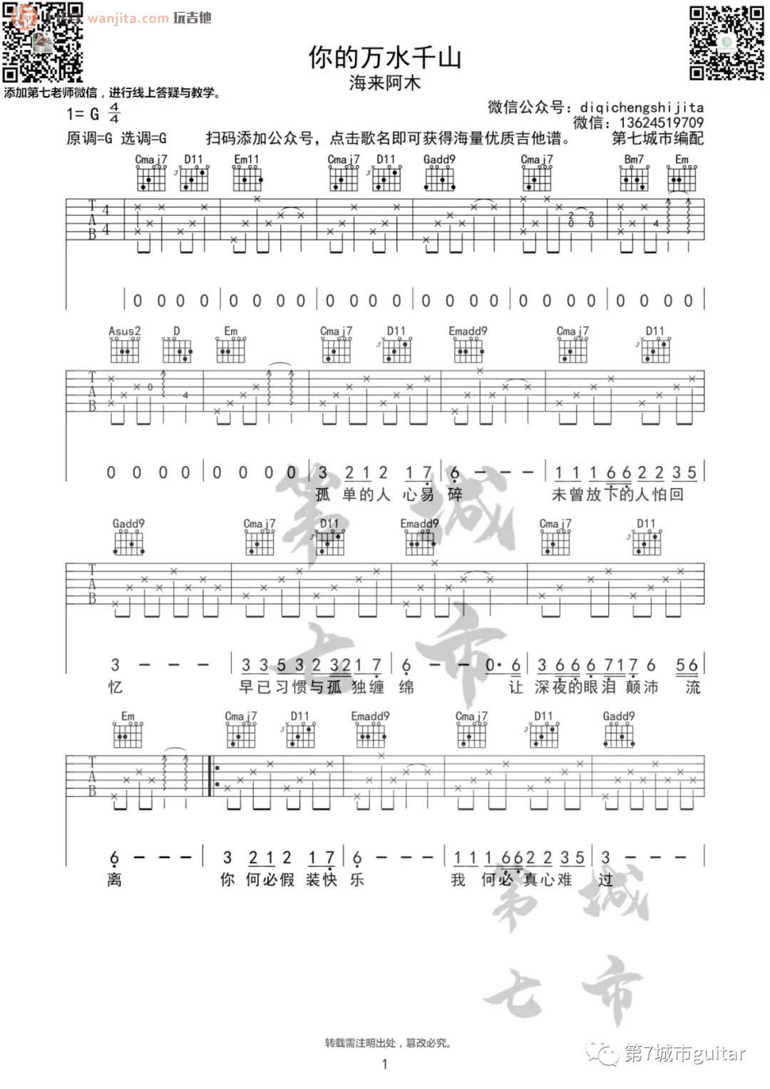 《阿木《你的万水千山吉他谱》(G调)》内容来自于互联网,不能保证内容的准确性与完整性,仅供学习交流欣赏,请勿用于其它用途,内容版权归原作者及来源网站所有,如有侵犯到您的权益请来信告知,我们将及时删除。