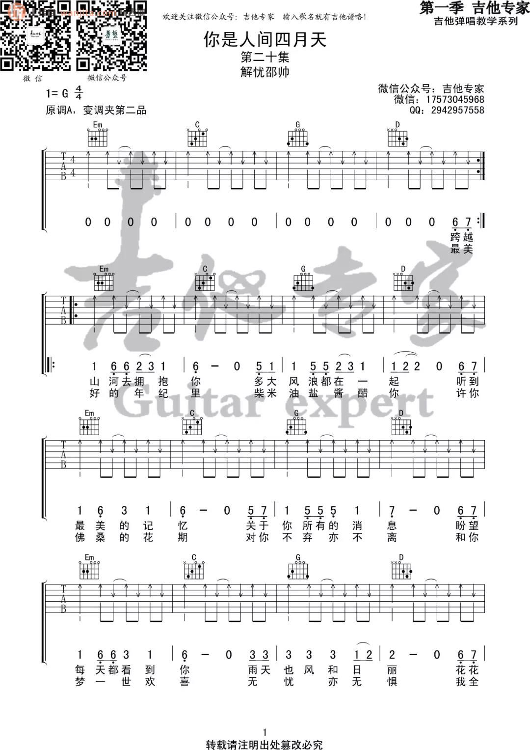 《邵帅《你是人间四月天吉他谱》(G调)》内容来自于互联网,不能保证内容的准确性与完整性,仅供学习交流欣赏,请勿用于其它用途,内容版权归原作者及来源网站所有,如有侵犯到您的权益请来信告知,我们将及时删除。