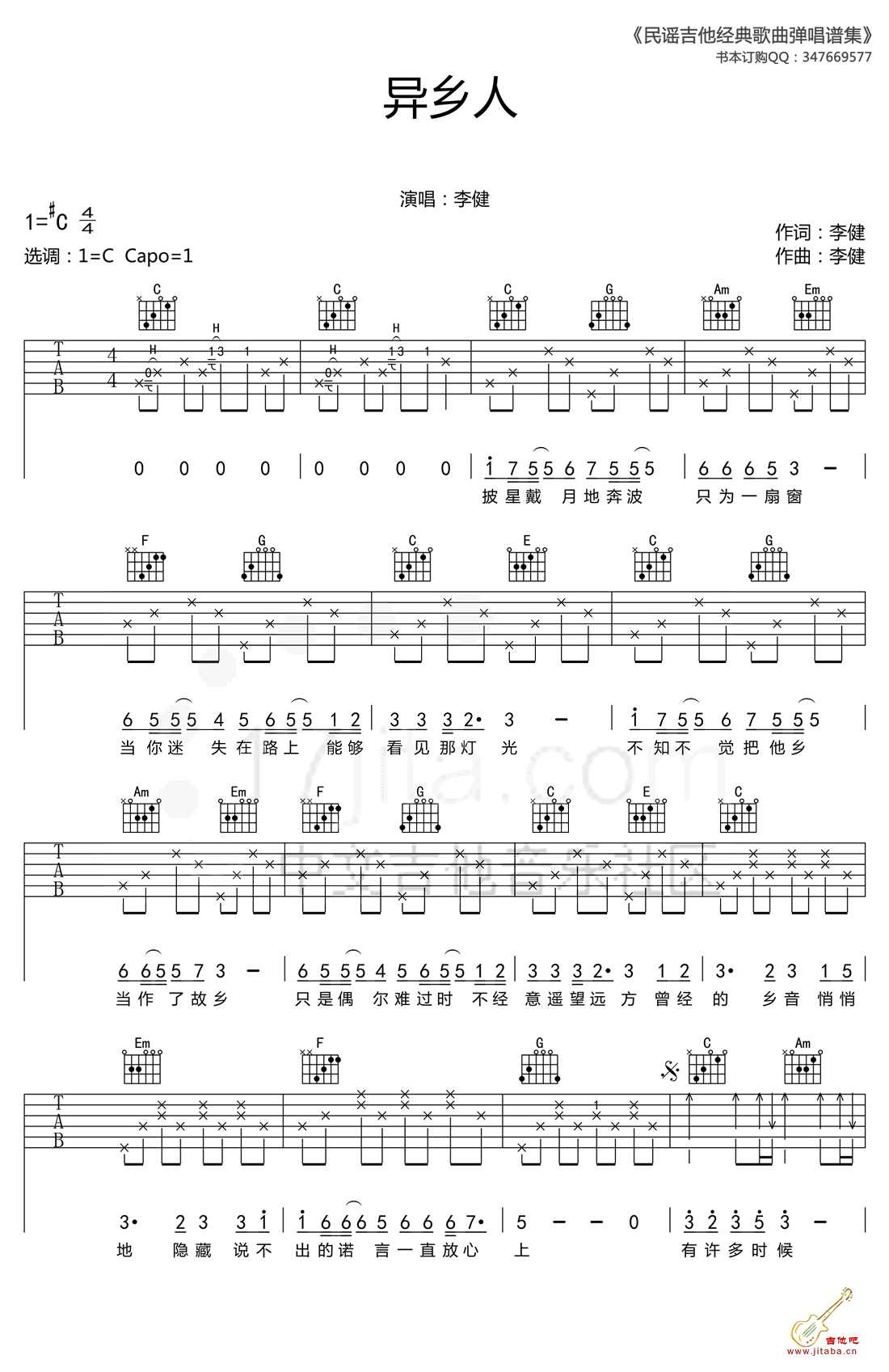 《李健《异乡人吉他谱》(C调)》内容来自于互联网,不能保证内容的准确性与完整性,仅供学习交流欣赏,请勿用于其它用途,内容版权归原作者及来源网站所有,如有侵犯到您的权益请来信告知,我们将及时删除。