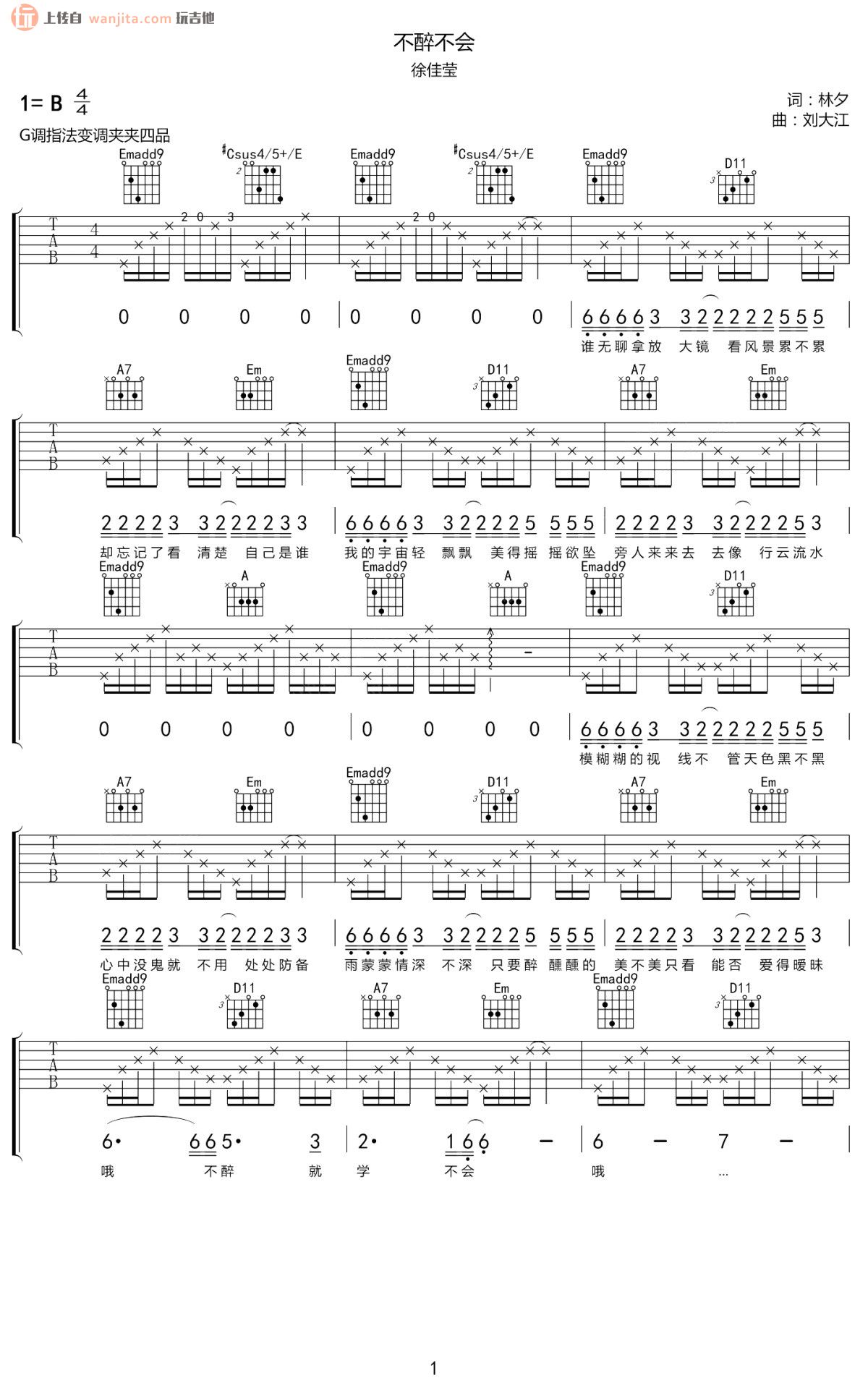 《徐佳莹《不醉不会吉他谱》(G调)》内容来自于互联网,不能保证内容的准确性与完整性,仅供学习交流欣赏,请勿用于其它用途,内容版权归原作者及来源网站所有,如有侵犯到您的权益请来信告知,我们将及时删除。