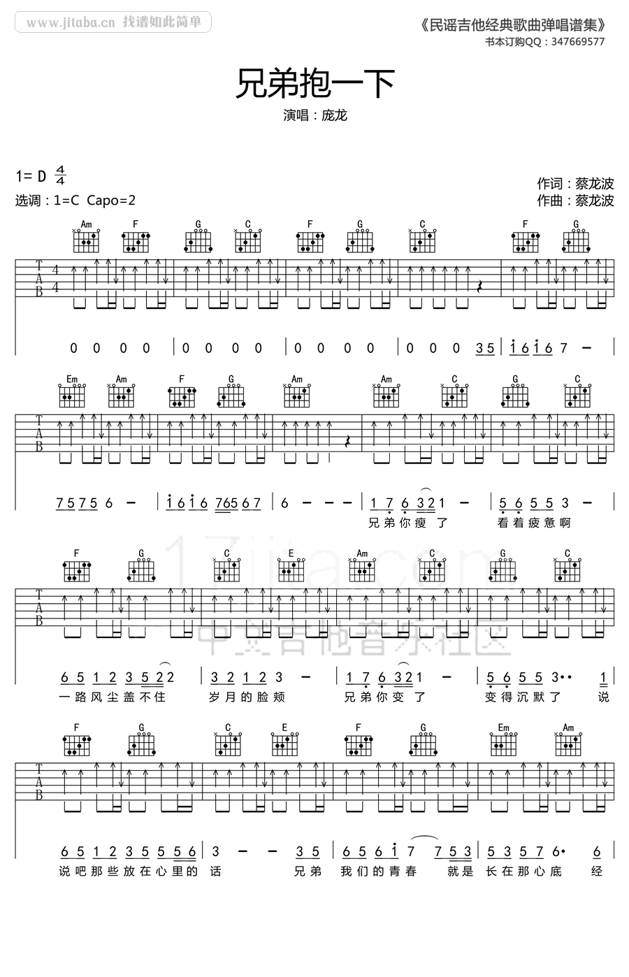 《庞龙《兄弟抱一下吉他谱》(C调)》内容来自于互联网,不能保证内容的准确性与完整性,仅供学习交流欣赏,请勿用于其它用途,内容版权归原作者及来源网站所有,如有侵犯到您的权益请来信告知,我们将及时删除。