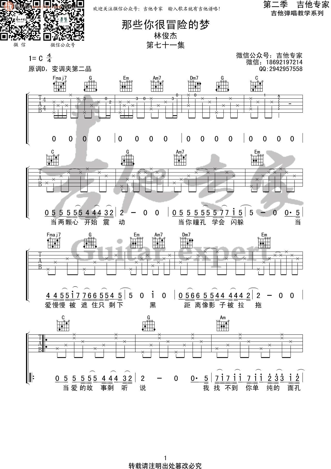 《林俊杰《那些你很冒险的梦吉他谱》(C调)》内容来自于互联网,不能保证内容的准确性与完整性,仅供学习交流欣赏,请勿用于其它用途,内容版权归原作者及来源网站所有,如有侵犯到您的权益请来信告知,我们将及时删除。