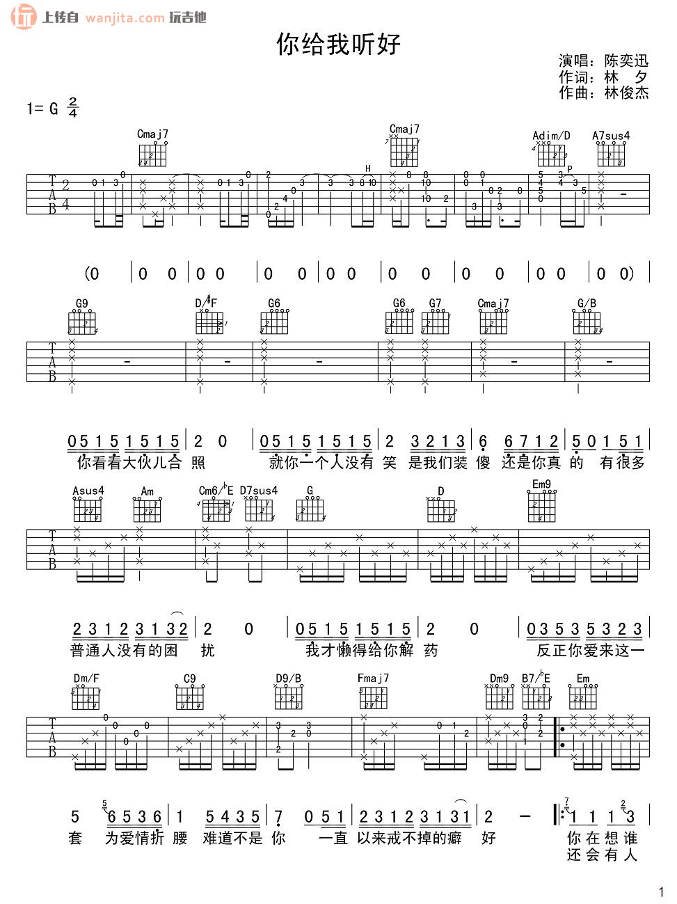 《陈奕迅《你给我听好吉他谱》(G调)》内容来自于互联网,不能保证内容的准确性与完整性,仅供学习交流欣赏,请勿用于其它用途,内容版权归原作者及来源网站所有,如有侵犯到您的权益请来信告知,我们将及时删除。