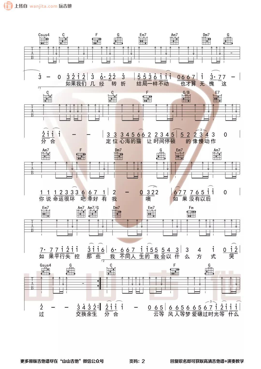 《交换余生》吉他谱由山山吉他制谱分享,以D调为原调,采用C调指法,使用变调夹夹在第2品位即可轻松演奏原调。在下方提供了完整的吉他弹唱视频教学,同时还包含了部分歌曲演唱示范。通过这份教学,喜欢这首歌曲的朋友们可以事先参考并学习。山山吉他制谱的用心制作让学习过程更