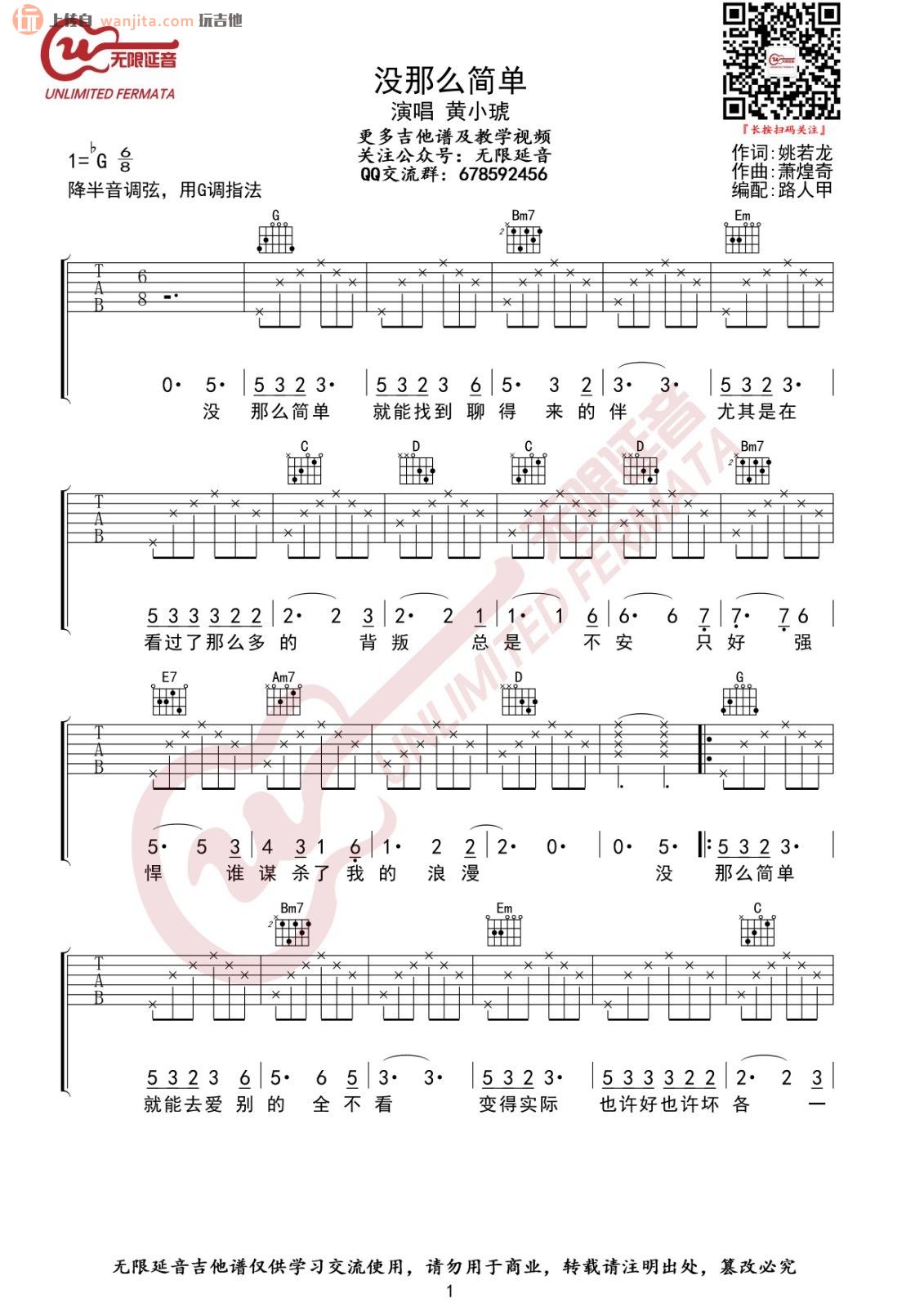 《黄小琥《没那么简单吉他谱》(G调)》内容来自于互联网,不能保证内容的准确性与完整性,仅供学习交流欣赏,请勿用于其它用途,内容版权归原作者及来源网站所有,如有侵犯到您的权益请来信告知,我们将及时删除。