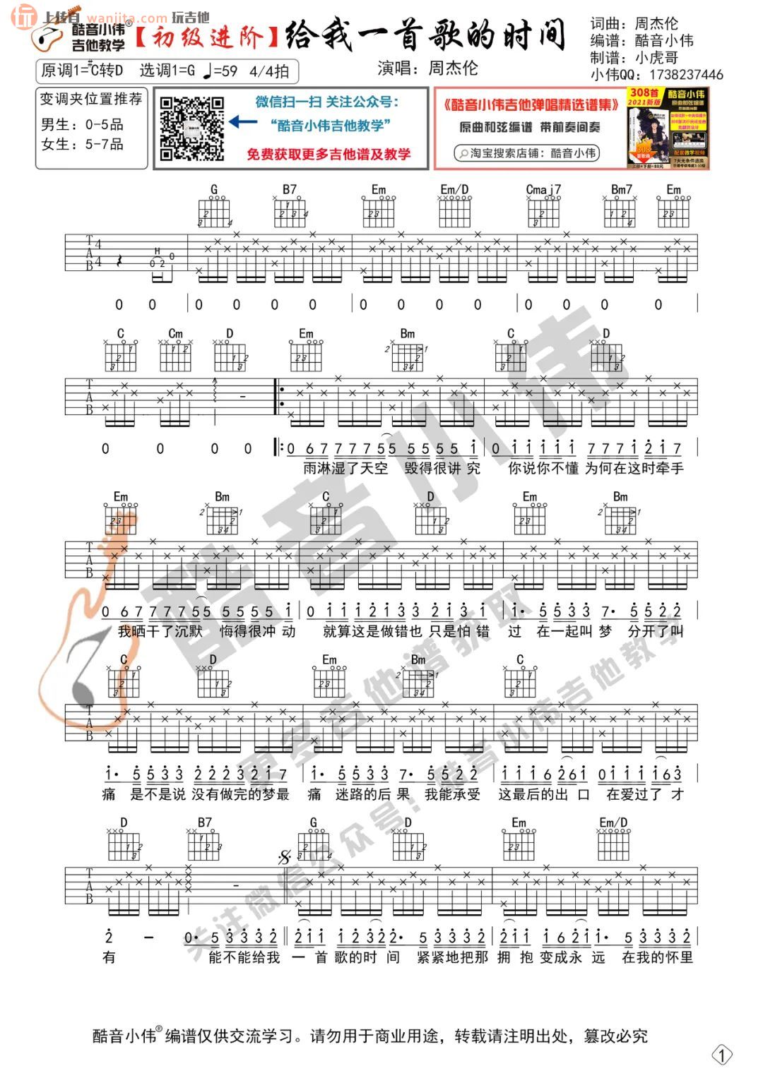 《周杰伦《给我一首歌的时间吉他谱》(G调)》内容来自于互联网,不能保证内容的准确性与完整性,仅供学习交流欣赏,请勿用于其它用途,内容版权归原作者及来源网站所有,如有侵犯到您的权益请来信告知,我们将及时删除。