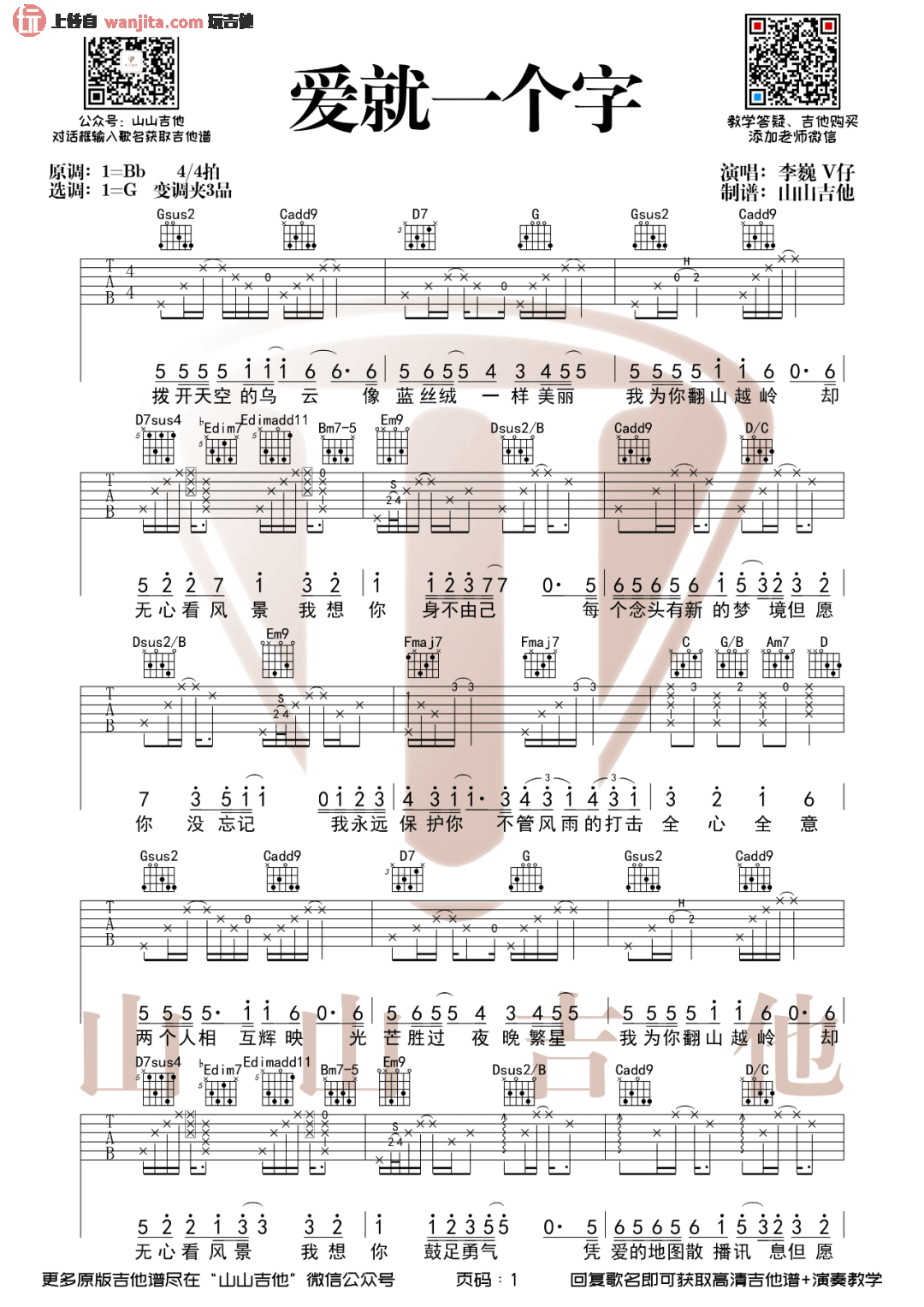 李巍V仔的《爱就一个字》吉他谱以G调为主,使用变调夹夹3品演奏原曲,由山山吉他制谱编配。原调为bB,演奏时可参考吉他弹唱教学视频。欢迎喜欢的朋友学习演奏,不容错过哦!