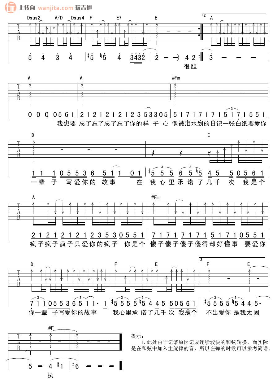 《魏晨《疯人愿吉他谱》(A调)》内容来自于互联网,不能保证内容的准确性与完整性,仅供学习交流欣赏,请勿用于其它用途,内容版权归原作者及来源网站所有,如有侵犯到您的权益请来信告知,我们将及时删除。