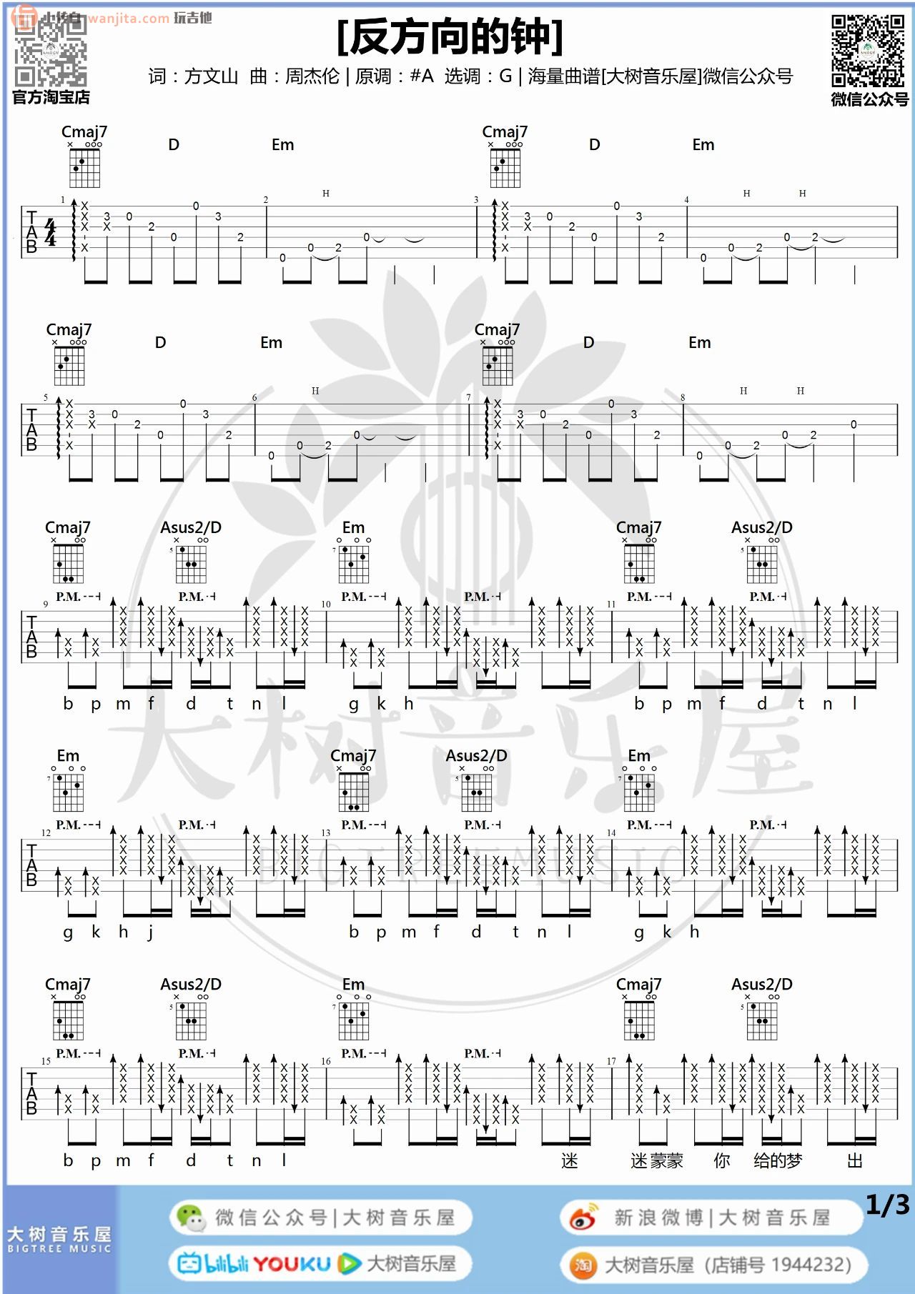 《周杰伦《反方向的钟吉他谱》(G调)》内容来自于互联网,不能保证内容的准确性与完整性,仅供学习交流欣赏,请勿用于其它用途,内容版权归原作者及来源网站所有,如有侵犯到您的权益请来信告知,我们将及时删除。