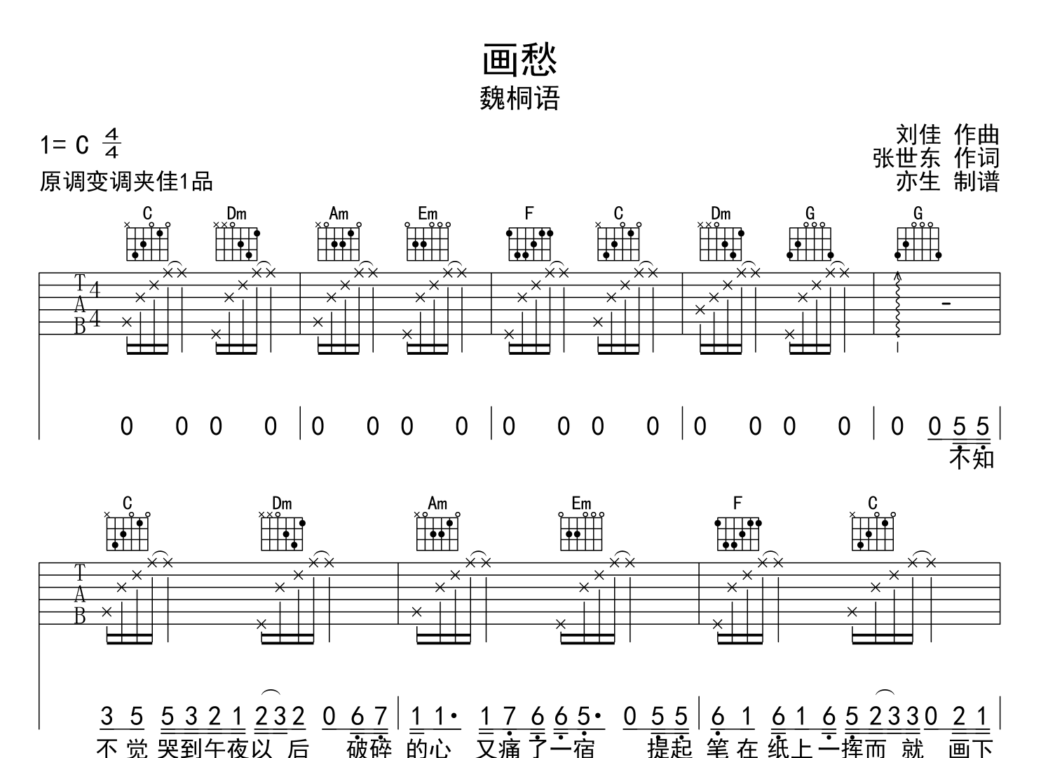 魏桐语的《画愁》吉他谱由@亦生制作,采用C调指法编配,原调#C,节奏4/4拍,共三张谱图。演奏时需使用变调夹夹第1品,速度控制在每分钟95拍左右,指法难度较简单。