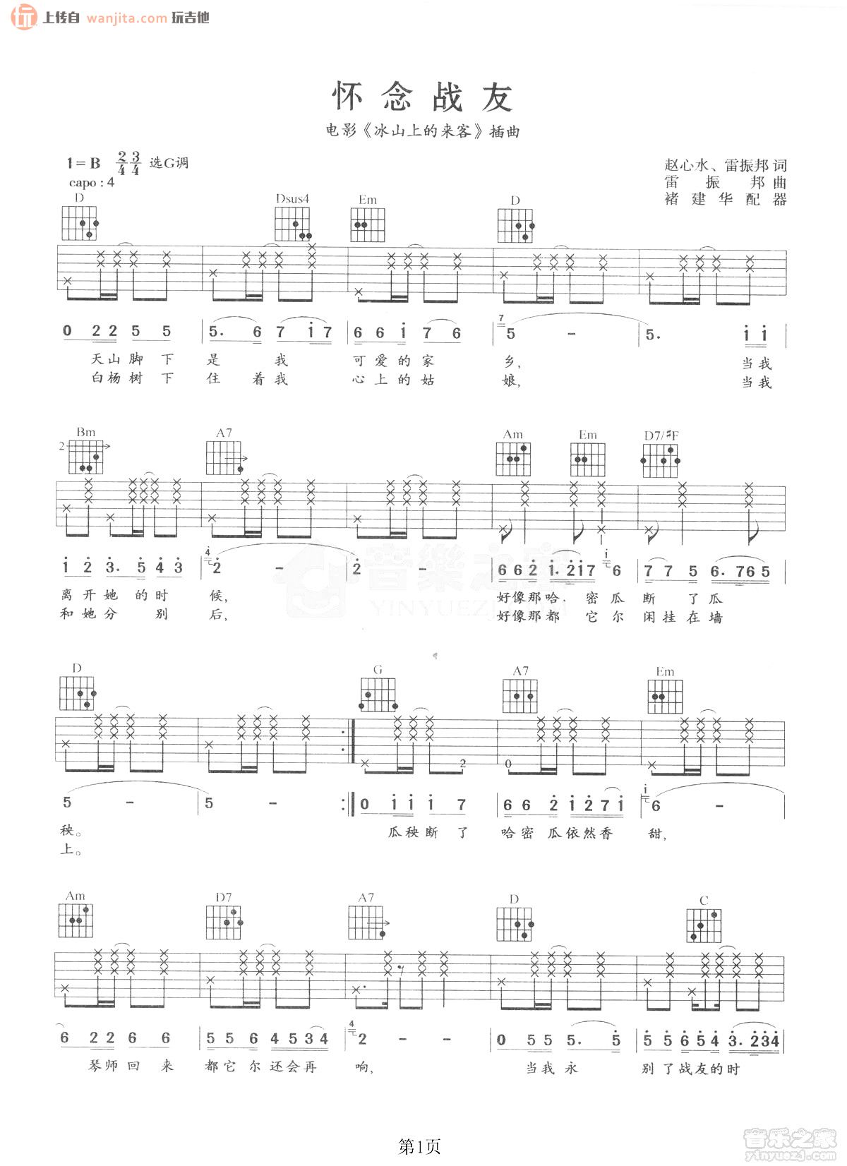《《怀念战友吉他谱》(G调)》内容来自于互联网,不能保证内容的准确性与完整性,仅供学习交流欣赏,请勿用于其它用途,内容版权归原作者及来源网站所有,如有侵犯到您的权益请来信告知,我们将及时删除。