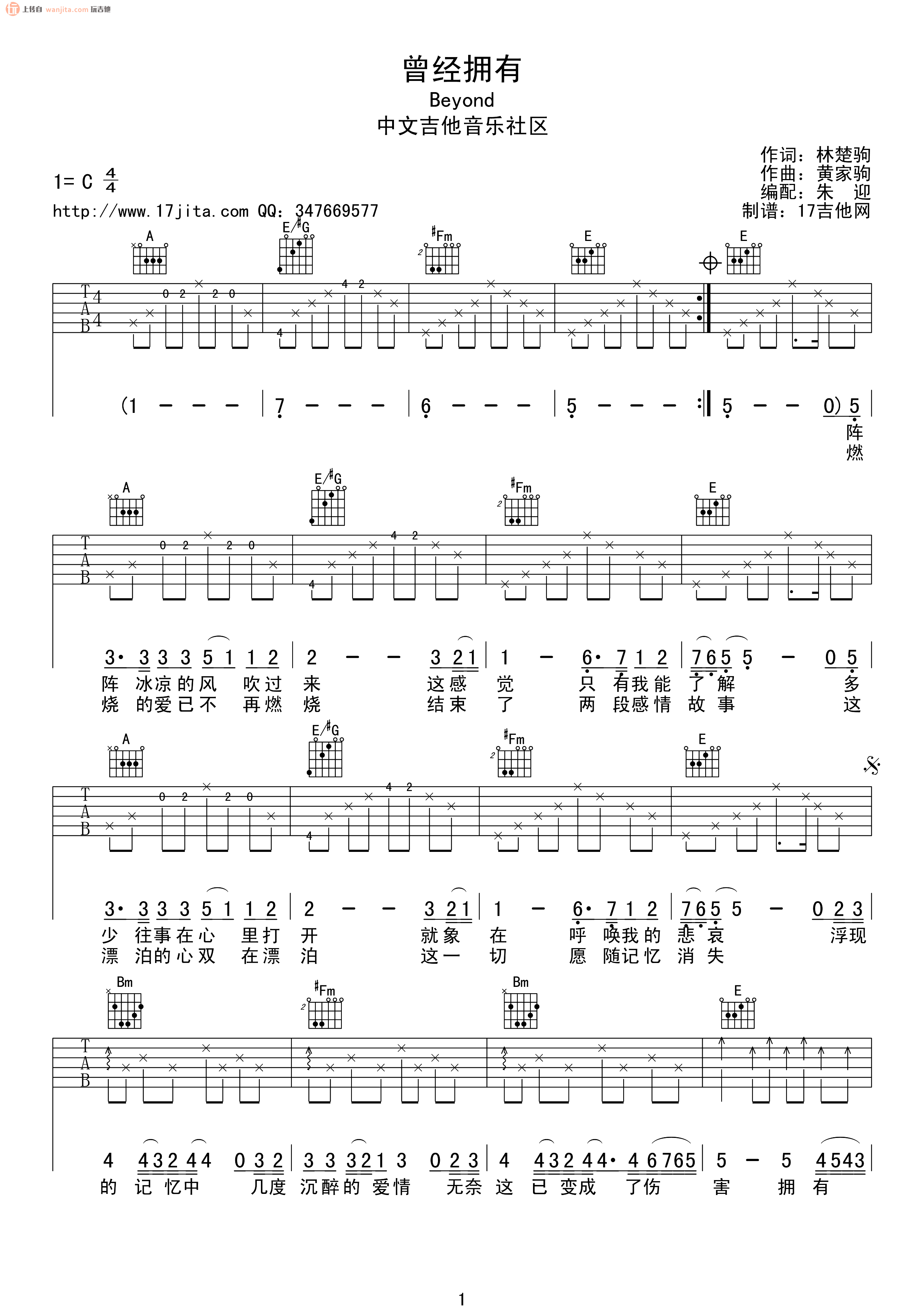 《Beyond《曾经拥有吉他谱》(C调)》内容来自于互联网,不能保证内容的准确性与完整性,仅供学习交流欣赏,请勿用于其它用途,内容版权归原作者及来源网站所有,如有侵犯到您的权益请来信告知,我们将及时删除。