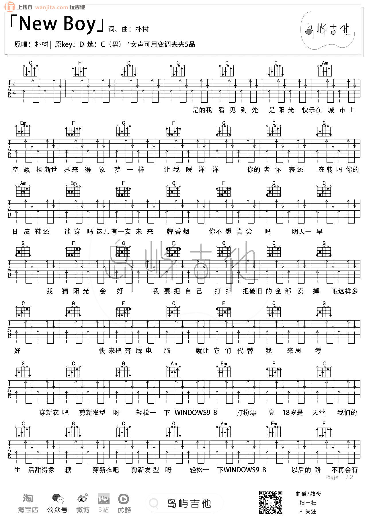 《朴树《new boy吉他谱》(C调)》内容来自于互联网,不能保证内容的准确性与完整性,仅供学习交流欣赏,请勿用于其它用途,内容版权归原作者及来源网站所有,如有侵犯到您的权益请来信告知,我们将及时删除。
