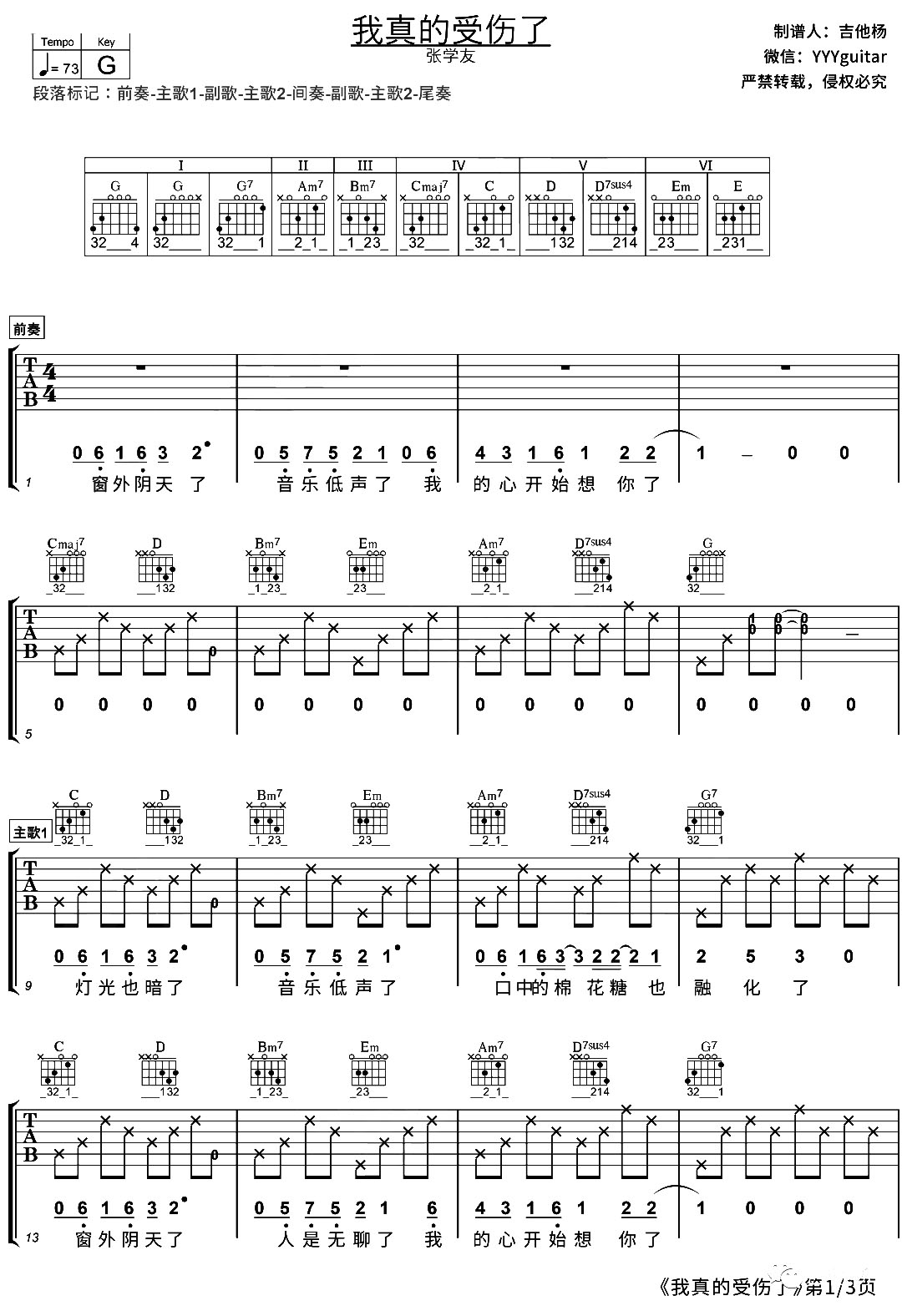 《张学友《我真的受伤了吉他谱》(G调)》内容来自于互联网,不能保证内容的准确性与完整性,仅供学习交流欣赏,请勿用于其它用途,内容版权归原作者及来源网站所有,如有侵犯到您的权益请来信告知,我们将及时删除。