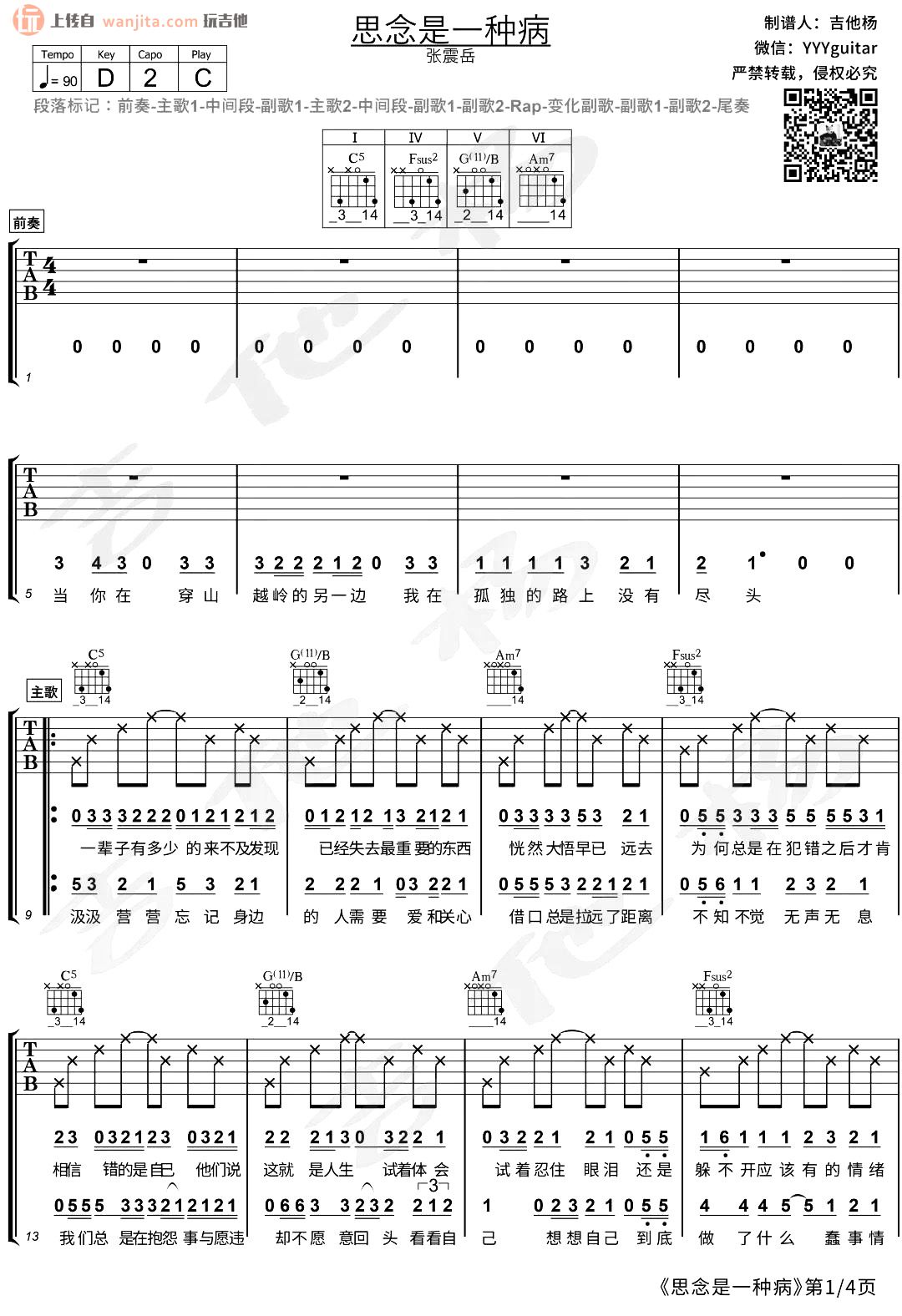 《张震岳《思念是一种病吉他谱》(C调)》内容来自于互联网,不能保证内容的准确性与完整性,仅供学习交流欣赏,请勿用于其它用途,内容版权归原作者及来源网站所有,如有侵犯到您的权益请来信告知,我们将及时删除。