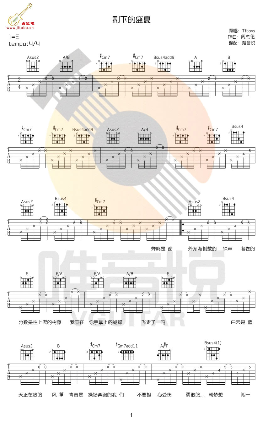 《周杰伦《剩下的盛夏吉他谱》》内容来自于互联网,不能保证内容的准确性与完整性,仅供学习交流欣赏,请勿用于其它用途,内容版权归原作者及来源网站所有,如有侵犯到您的权益请来信告知,我们将及时删除。