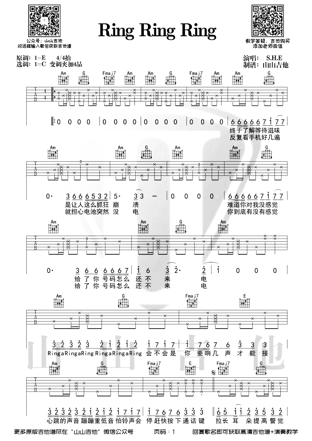 这首歌曲的曲谱由山山吉他精心编排,共有两张清晰的图片谱。原调为E调,使用C调指法,男生演奏时无需使用变调夹,而女生则可以使用变调夹固定在第四品位进行弹唱,保持原调。在下方提供了一段吉他弹唱演示视频,方便大家参考学习。视频标题为《ring ring ring》。