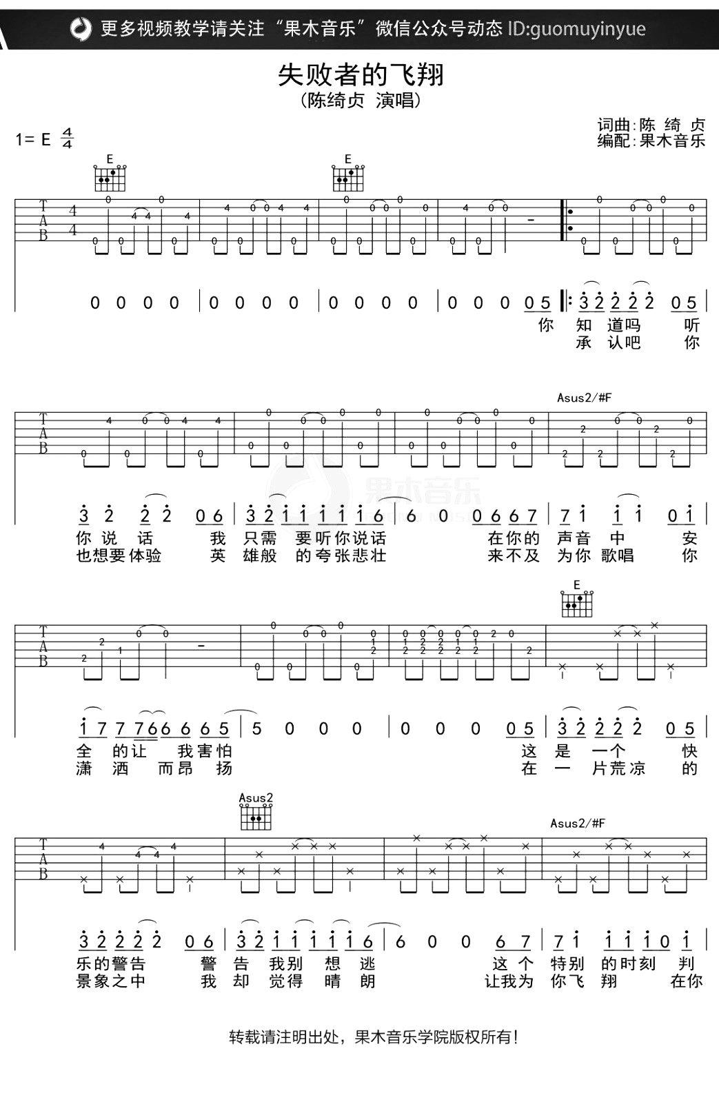 《陈绮贞《失败者的飞翔吉他谱》(E调)》内容来自于互联网,不能保证内容的准确性与完整性,仅供学习交流欣赏,请勿用于其它用途,内容版权归原作者及来源网站所有,如有侵犯到您的权益请来信告知,我们将及时删除。