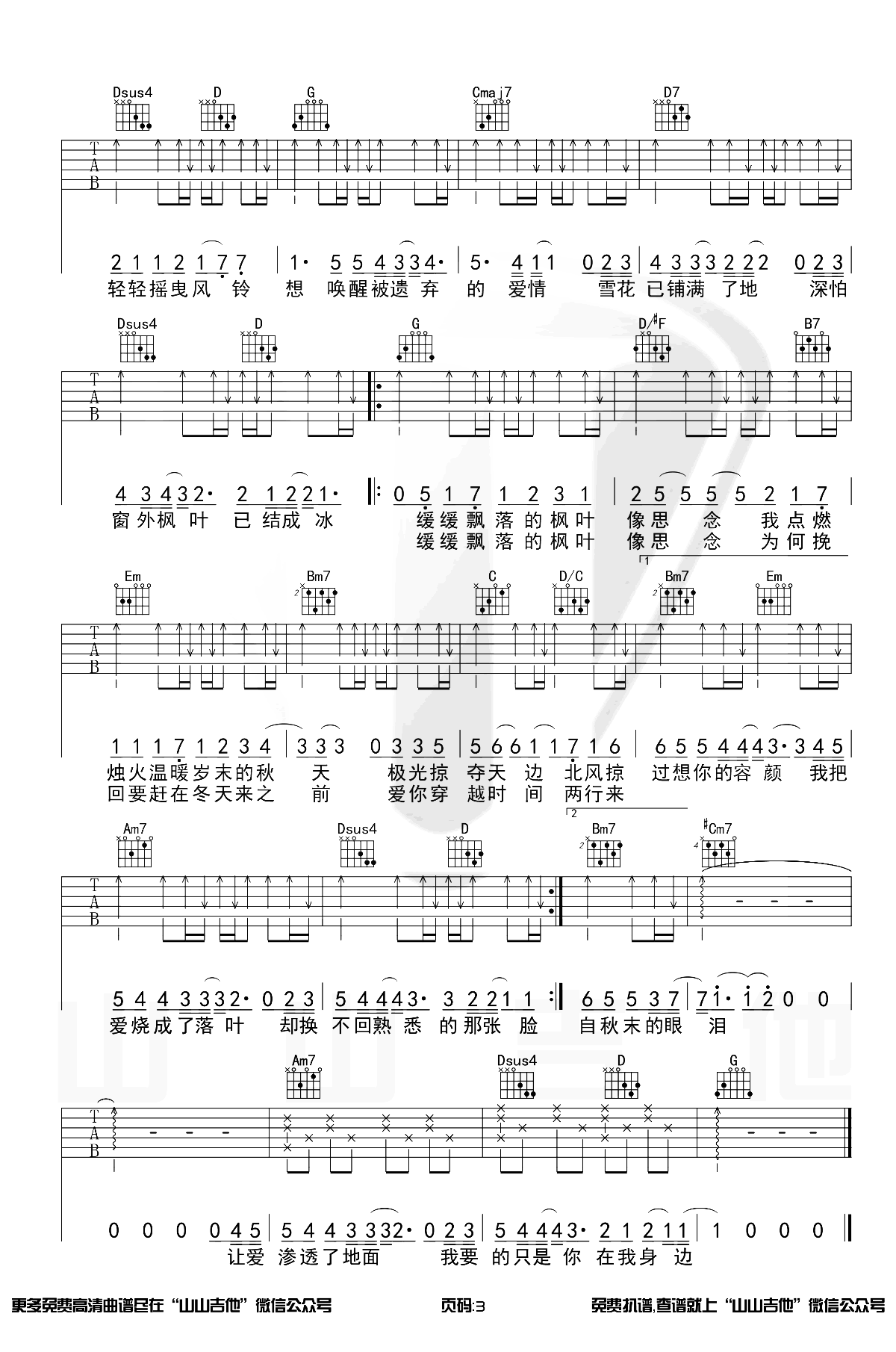 《枫》是一首吉他弹唱曲,由山山吉他编配制谱,总共3张高清图片谱。原调为C调,选用G调指法,变调夹可夹5品,曲谱完整,包含精彩的前奏。弹唱难度适中,适合各阶层音乐爱好者。推荐感兴趣的朋友观看下方的弹唱演示视频,更好地领会这首动人的音乐之美。