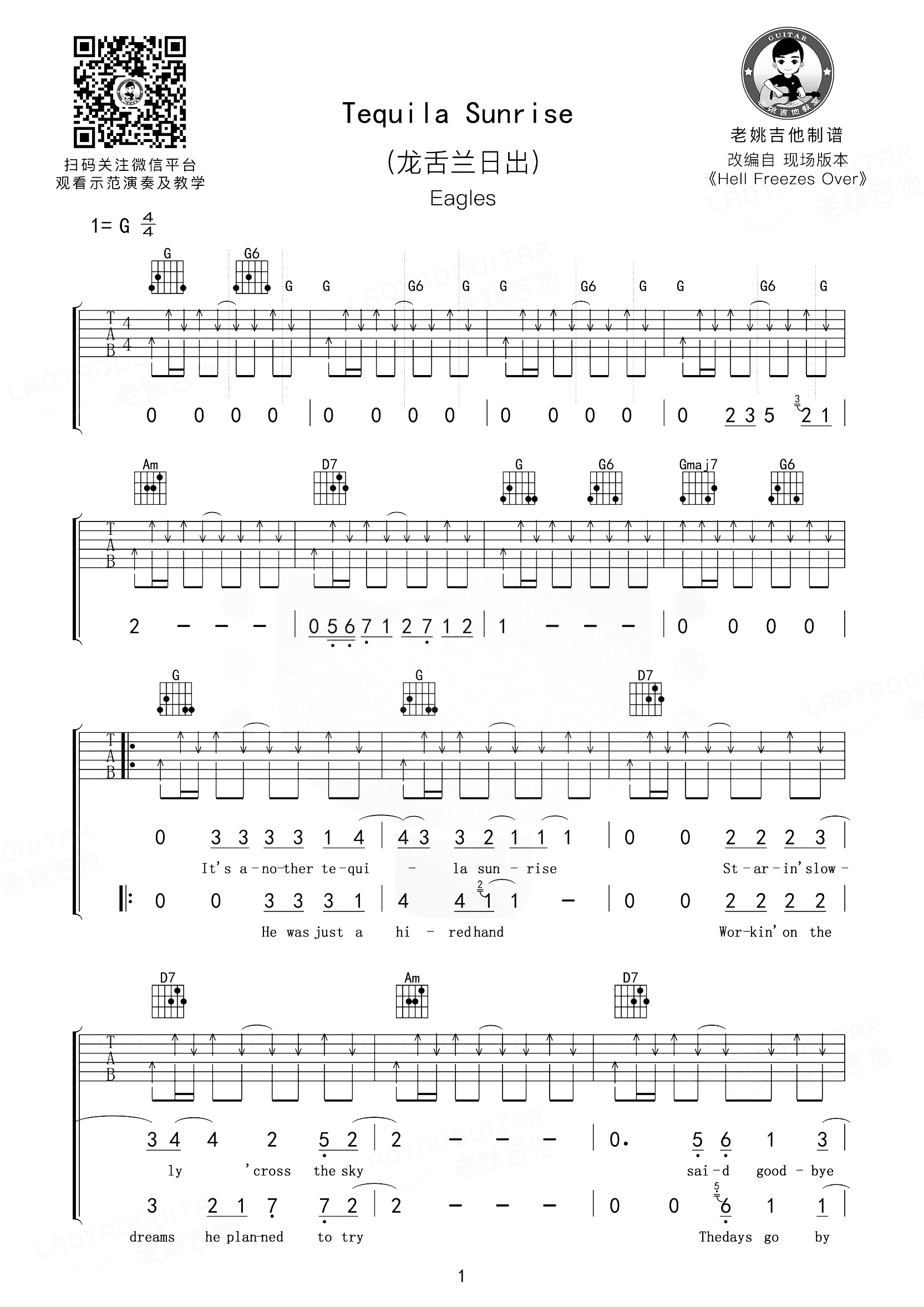 老鹰乐队的《Tequila Sunrise》吉他谱由老姚吉他精心编排,共包含4张高清图片谱,选用G调。整首曲子以全程扫弦的节奏为主,弹唱难度适中,不过只要掌握好节奏的层次感,便能完美演绎这首歌曲。老姚吉他的制谱精湛,使得这一谱面更具可读性。图片谱中详细展示了和