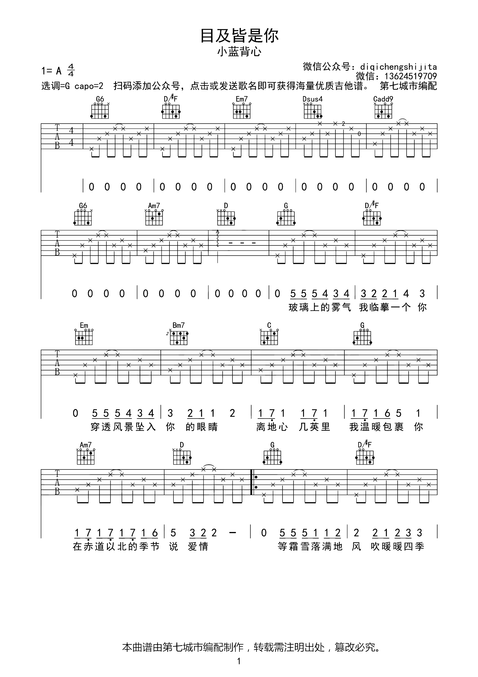 《小蓝背心《目及皆是你吉他谱》(G调)》内容来自于互联网,不能保证内容的准确性与完整性,仅供学习交流欣赏,请勿用于其它用途,内容版权归原作者及来源网站所有,如有侵犯到您的权益请来信告知,我们将及时删除。