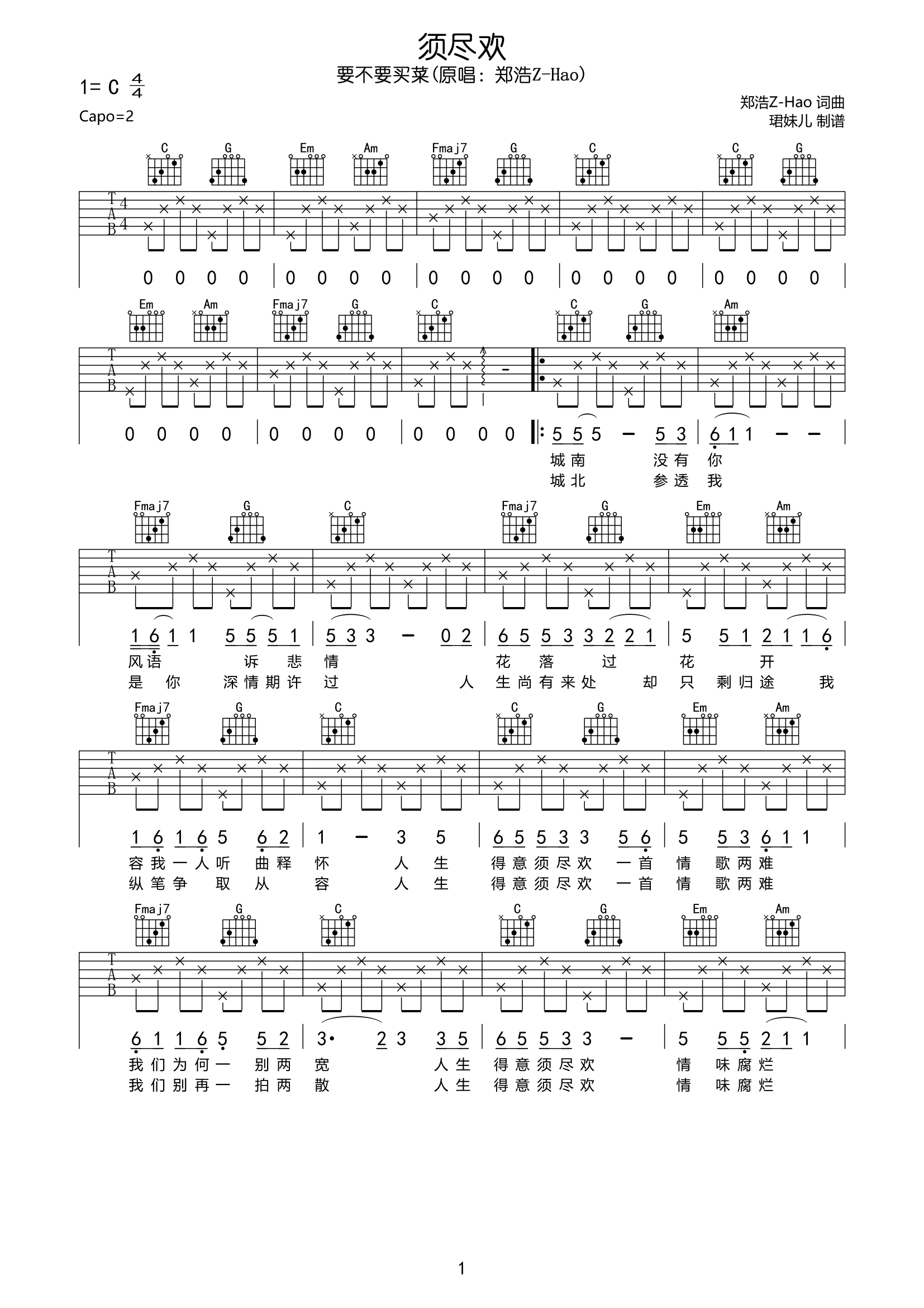 《要不要买菜《须尽欢吉他谱》(C调)》内容来自于互联网,不能保证内容的准确性与完整性,仅供学习交流欣赏,请勿用于其它用途,内容版权归原作者及来源网站所有,如有侵犯到您的权益请来信告知,我们将及时删除。