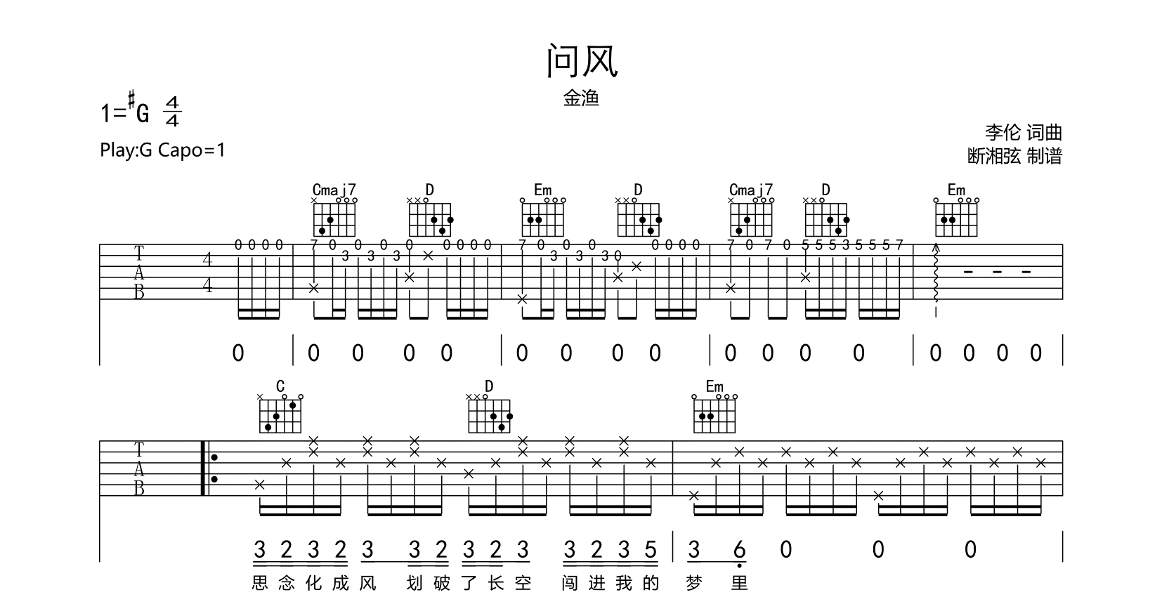 《金渔《问风吉他谱》(G调)》内容来自于互联网,不能保证内容的准确性与完整性,仅供学习交流欣赏,请勿用于其它用途,内容版权归原作者及来源网站所有,如有侵犯到您的权益请来信告知,我们将及时删除。