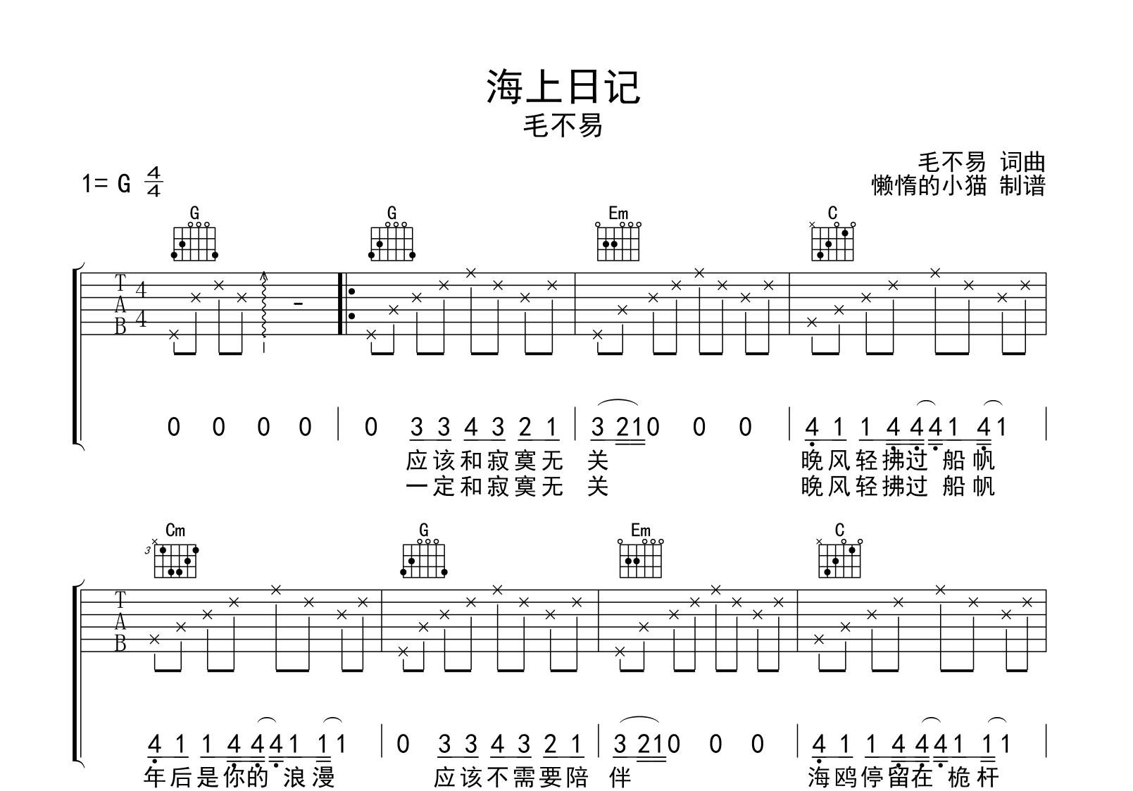 毛不易《海上日记吉他谱》(G调)