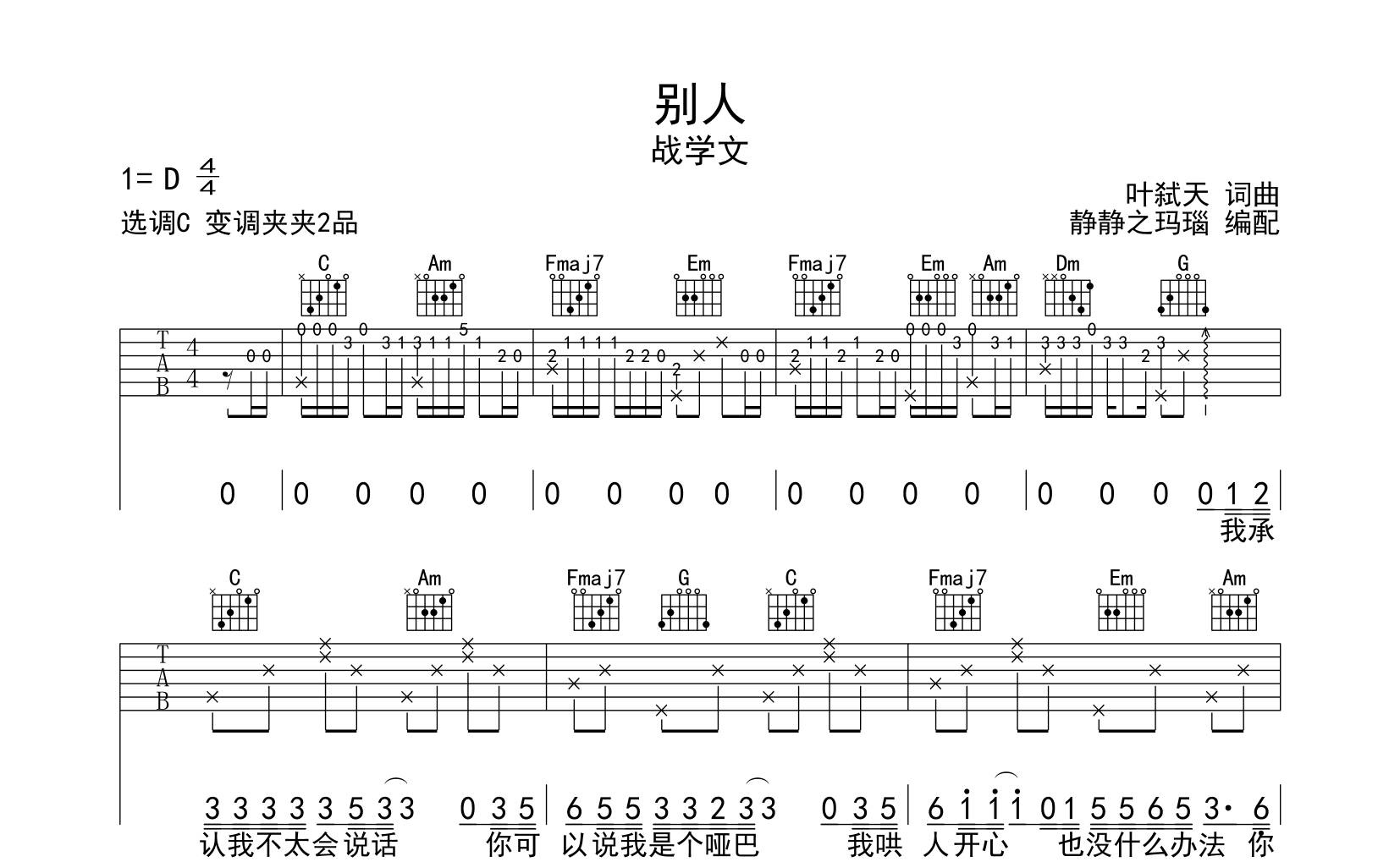 《战学文《别人吉他谱》(C调)》内容来自于互联网,不能保证内容的准确性与完整性,仅供学习交流欣赏,请勿用于其它用途,内容版权归原作者及来源网站所有,如有侵犯到您的权益请来信告知,我们将及时删除。