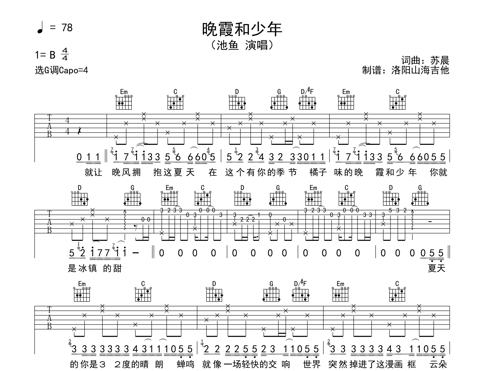 《池鱼《晚霞和少年吉他谱》(G调)》内容来自于互联网,不能保证内容的准确性与完整性,仅供学习交流欣赏,请勿用于其它用途,内容版权归原作者及来源网站所有,如有侵犯到您的权益请来信告知,我们将及时删除。