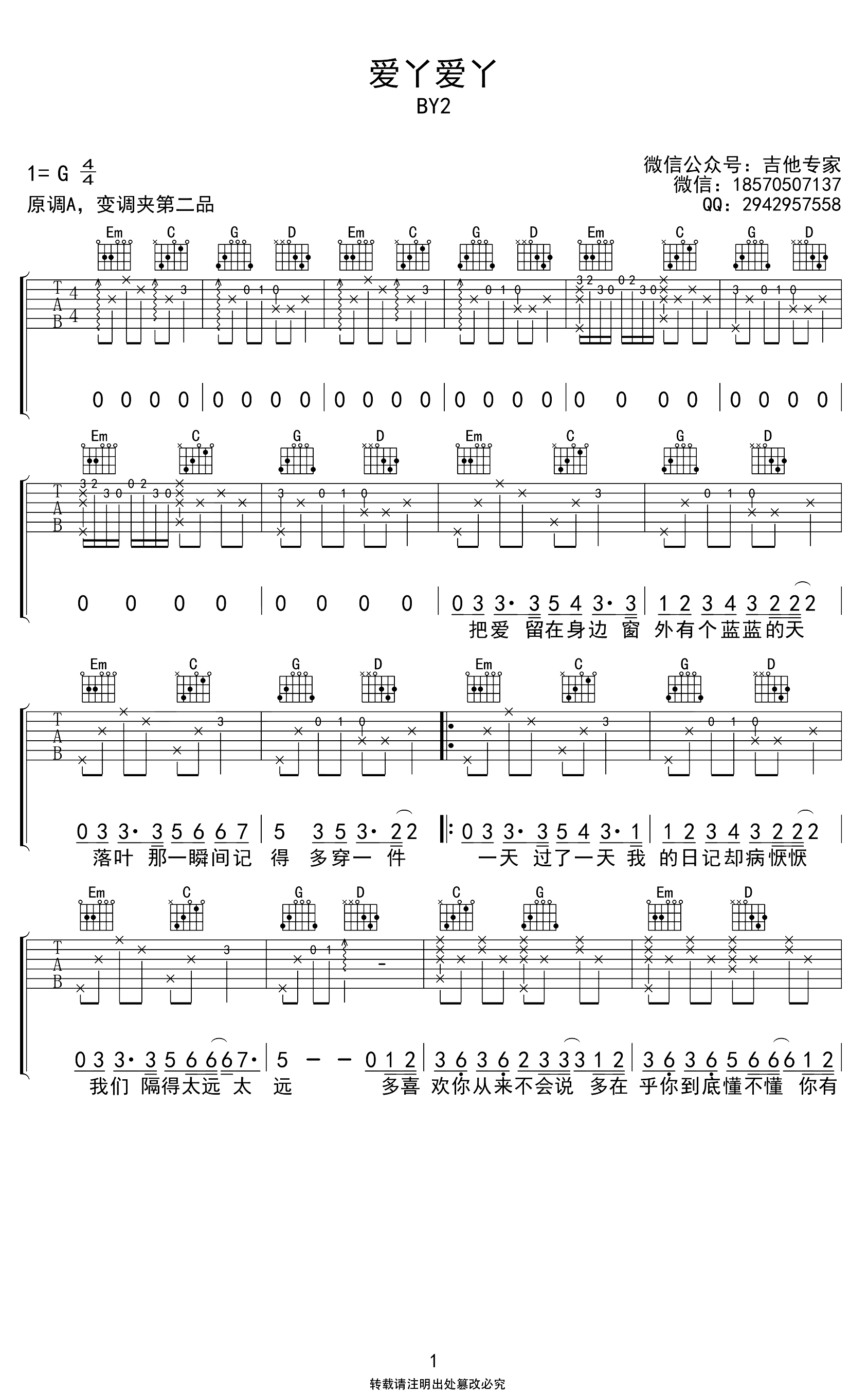 《《爱丫爱丫吉他谱》(G调)》内容来自于互联网,不能保证内容的准确性与完整性,仅供学习交流欣赏,请勿用于其它用途,内容版权归原作者及来源网站所有,如有侵犯到您的权益请来信告知,我们将及时删除。
