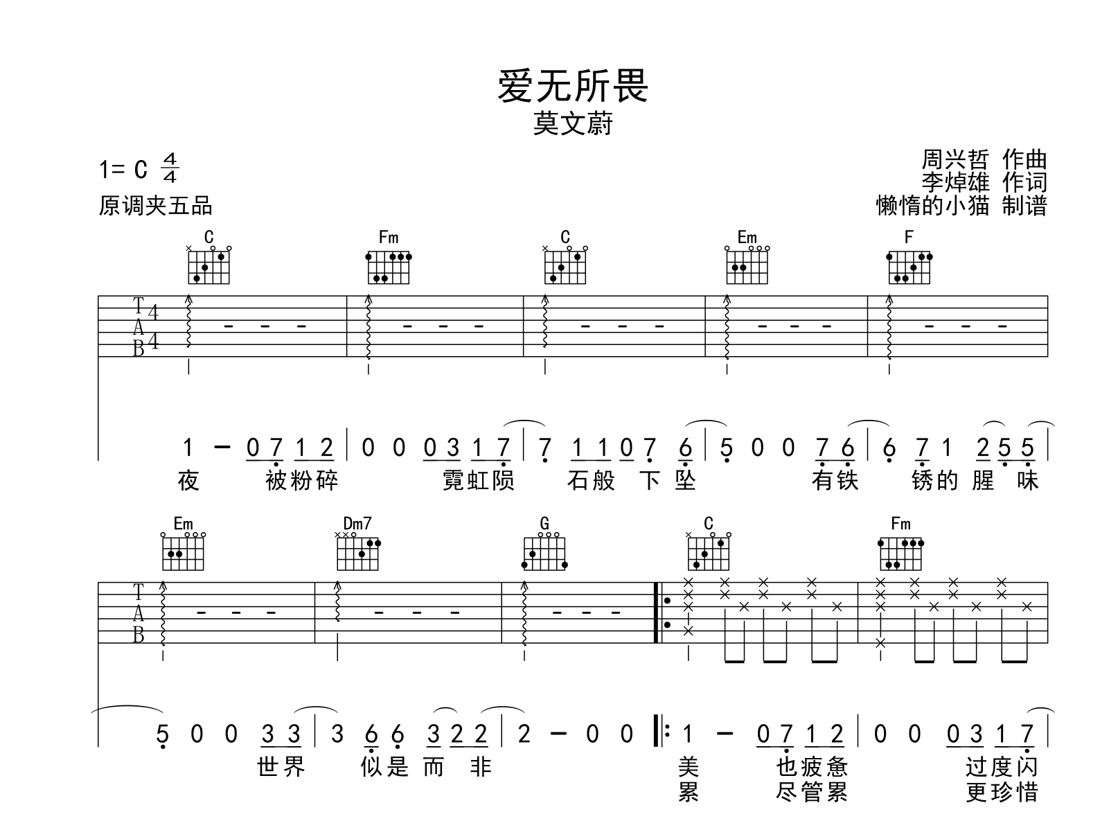 《莫文蔚《爱无所畏吉他谱》(C调)》内容来自于互联网,不能保证内容的准确性与完整性,仅供学习交流欣赏,请勿用于其它用途,内容版权归原作者及来源网站所有,如有侵犯到您的权益请来信告知,我们将及时删除。