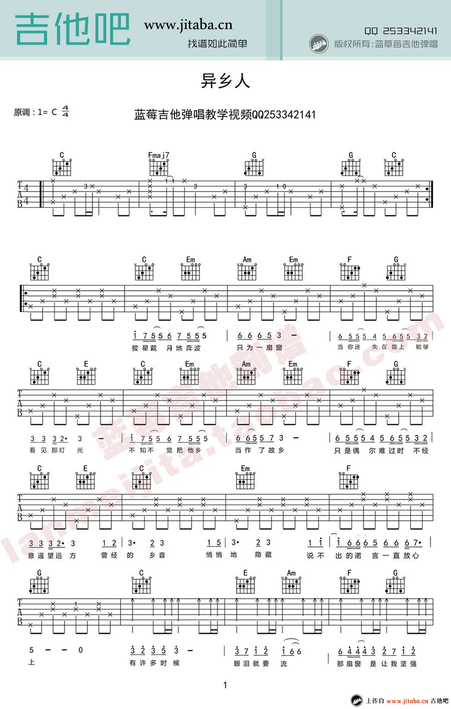 《李健《异乡人吉他谱》(C调)》内容来自于互联网,不能保证内容的准确性与完整性,仅供学习交流欣赏,请勿用于其它用途,内容版权归原作者及来源网站所有,如有侵犯到您的权益请来信告知,我们将及时删除。