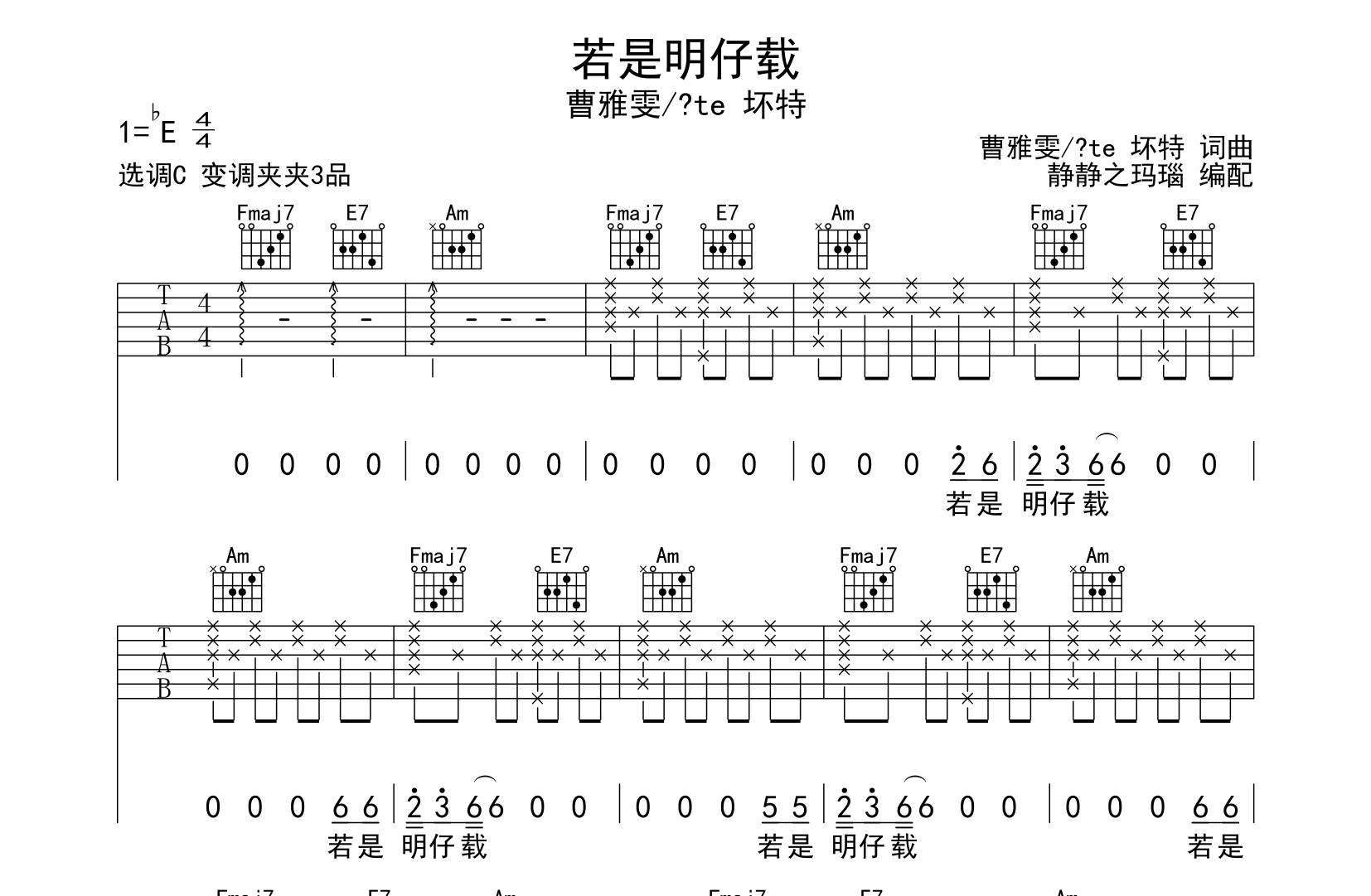 这是一首由创作者静静之玛瑙编配的吉他曲《若是明仔载》。曲谱采用C调和弦指法,4/4拍的节奏,速度为每分钟70拍。建议使用变调夹夹在3品,当然也可根据个人嗓音找到更舒适的位置。整体弹唱难度较为简单,适合各层次的吉他手演奏。