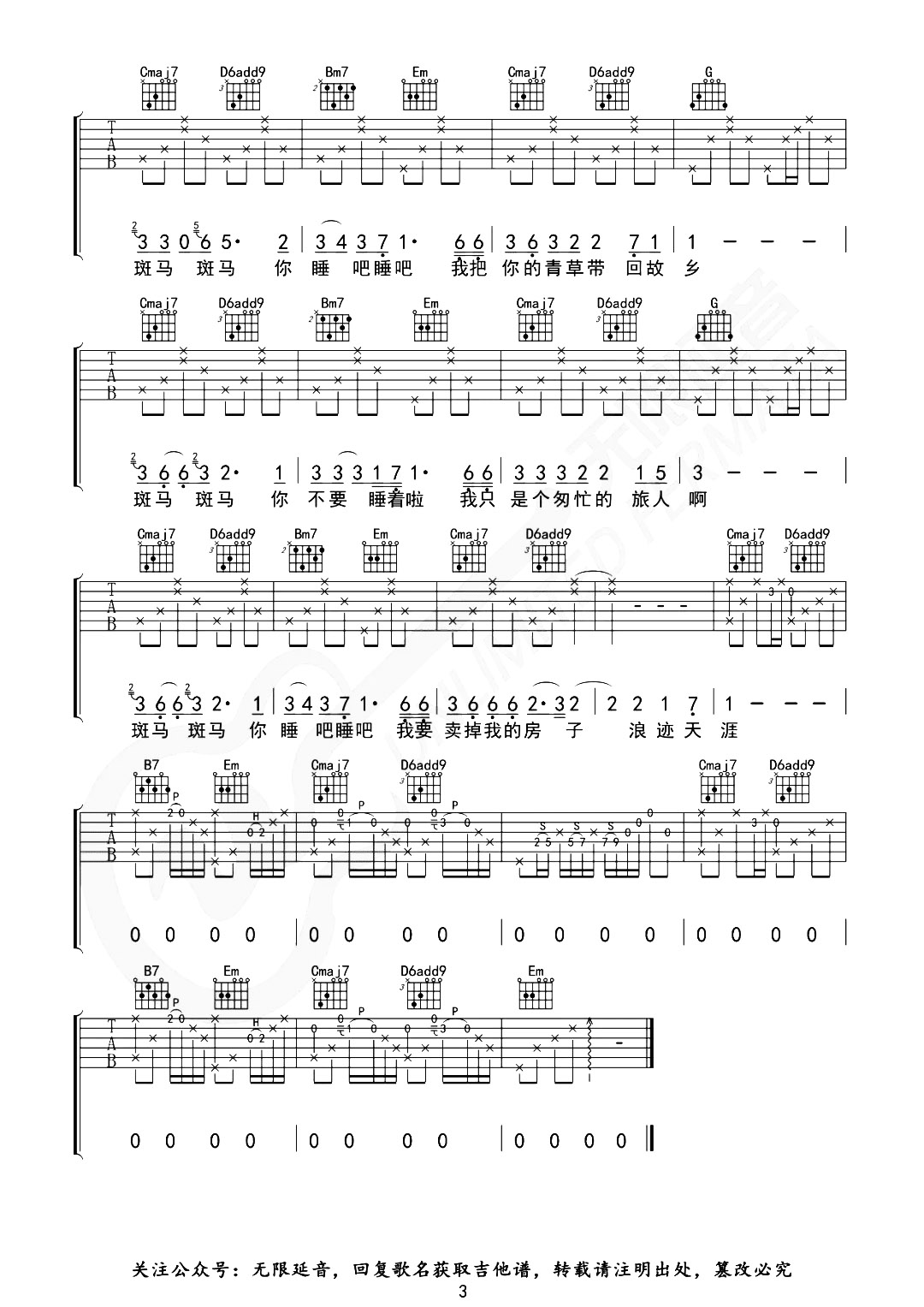 《宋冬野《斑马斑马吉他谱》(G调)》内容来自于互联网,不能保证内容的准确性与完整性,仅供学习交流欣赏,请勿用于其它用途,内容版权归原作者及来源网站所有,如有侵犯到您的权益请来信告知,我们将及时删除。