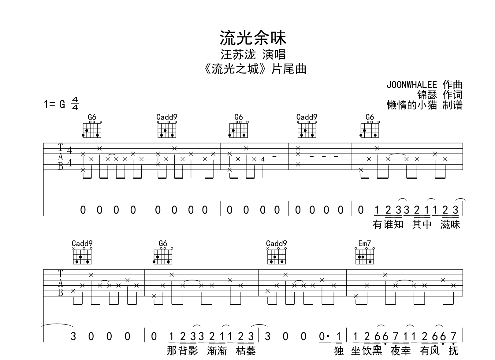 《汪苏泷《流光余味吉他谱》(G调)》内容来自于互联网,不能保证内容的准确性与完整性,仅供学习交流欣赏,请勿用于其它用途,内容版权归原作者及来源网站所有,如有侵犯到您的权益请来信告知,我们将及时删除。