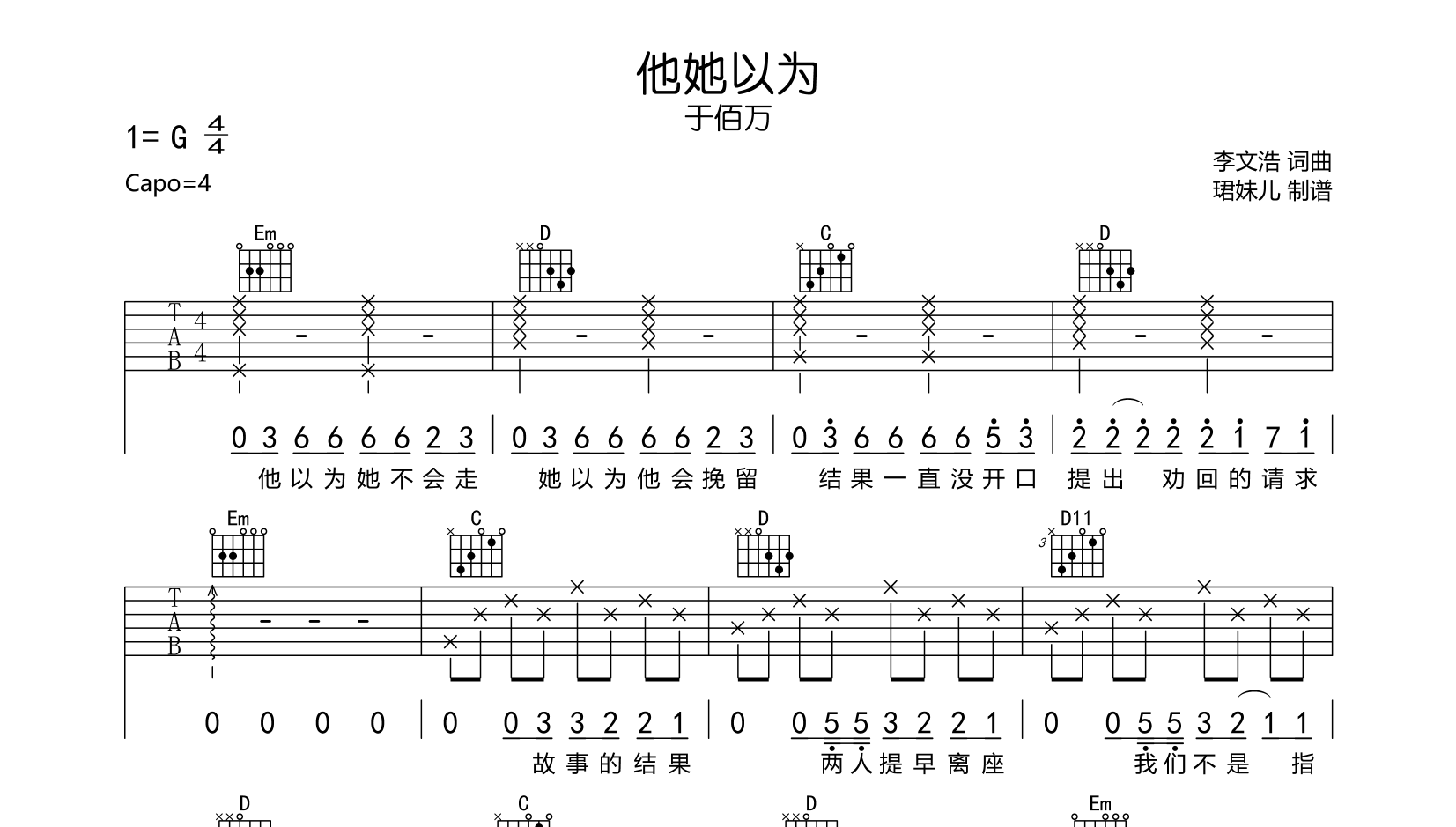 《于佰万《他她以为吉他谱》(G调)》内容来自于互联网,不能保证内容的准确性与完整性,仅供学习交流欣赏,请勿用于其它用途,内容版权归原作者及来源网站所有,如有侵犯到您的权益请来信告知,我们将及时删除。