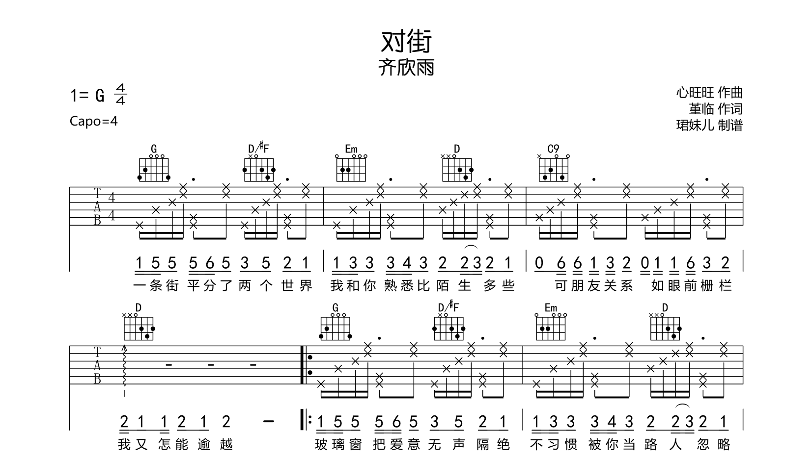 《齐欣雨《对街吉他谱》(G调)》内容来自于互联网,不能保证内容的准确性与完整性,仅供学习交流欣赏,请勿用于其它用途,内容版权归原作者及来源网站所有,如有侵犯到您的权益请来信告知,我们将及时删除。