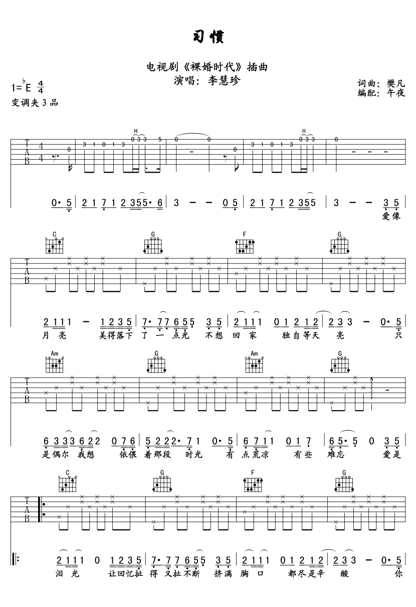 李慧珍演唱的《裸婚时代》电视剧插曲《习惯》的吉他谱,由午夜制谱,以C调和弦编配。建议在3品处弹唱,适合初学者,难度较简单。这份谱子共有两张高清图片,让你更轻松地学习弹唱这首歌。