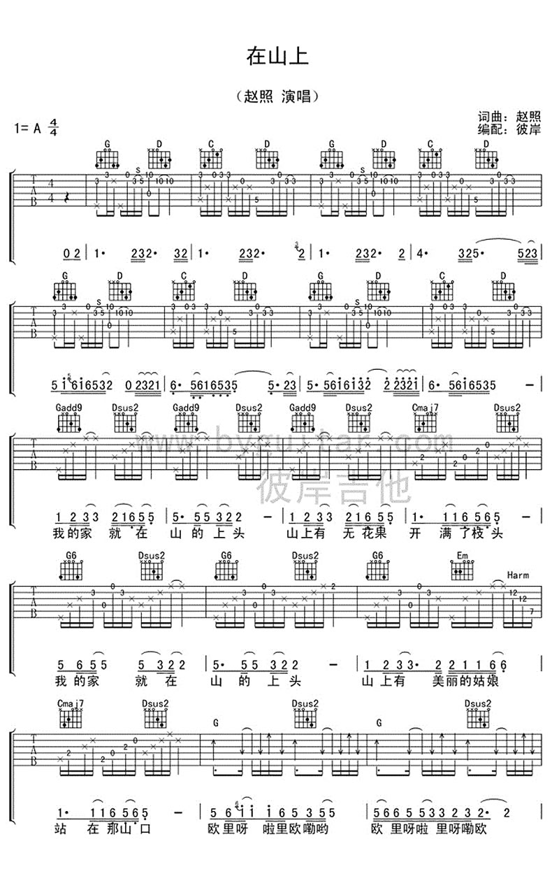 这是赵照创作的一首民谣歌曲,收录于2010年发布的专辑《大经厂》中。歌曲名为《在山上》,由赵照作词作曲,并以六线谱形式编配了吉他谱。这首歌以禅意风格为特色,吉他弹唱谱展现了一种在山间吟唱的宁静感觉。曲调简单温暖,充满了美好的情感。感谢彼岸的编配,为赵照的吉他谱
