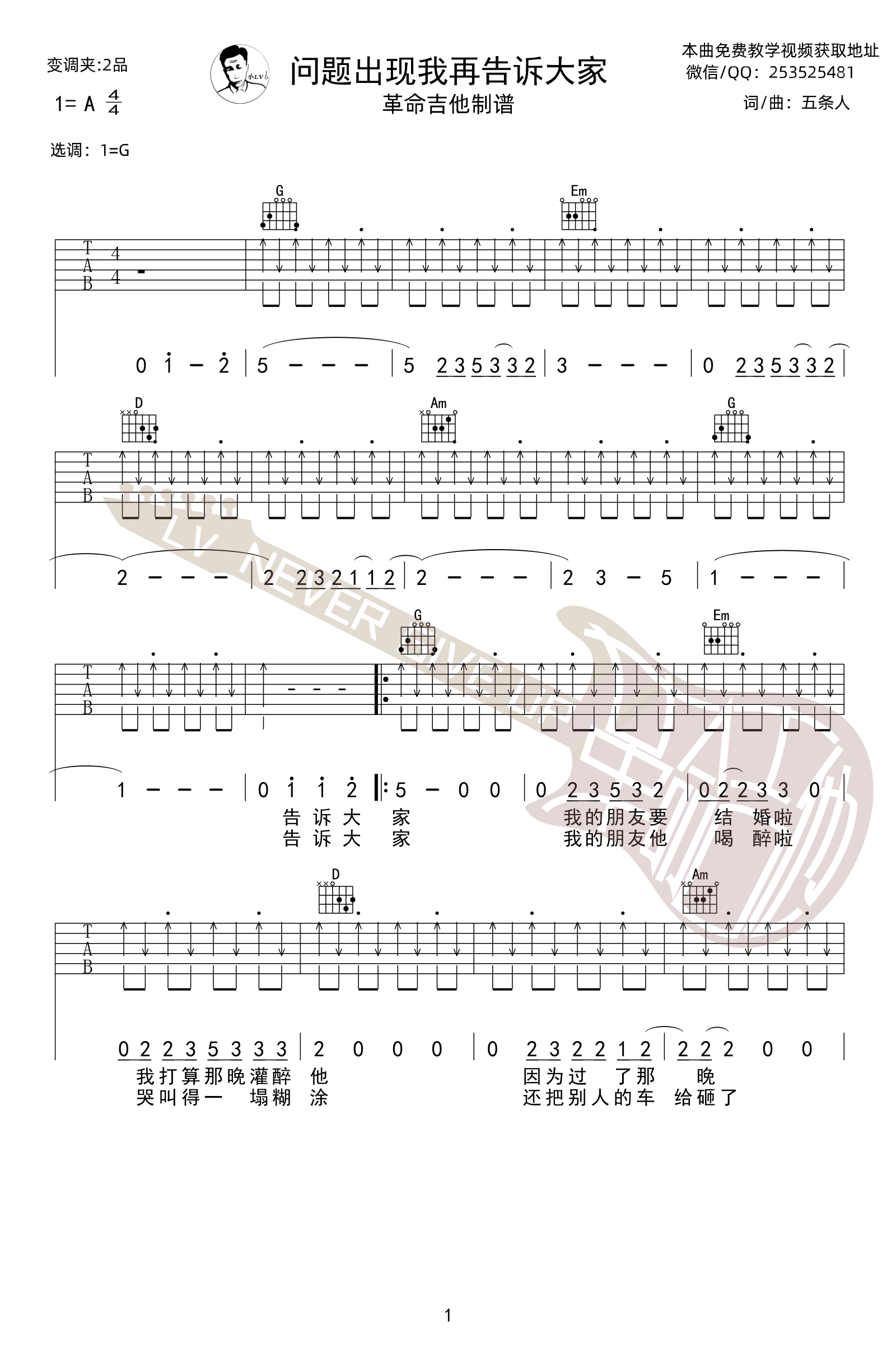 《五条人《问题出现我再告诉大家吉他谱》(G调)》内容来自于互联网,不能保证内容的准确性与完整性,仅供学习交流欣赏,请勿用于其它用途,内容版权归原作者及来源网站所有,如有侵犯到您的权益请来信告知,我们将及时删除。