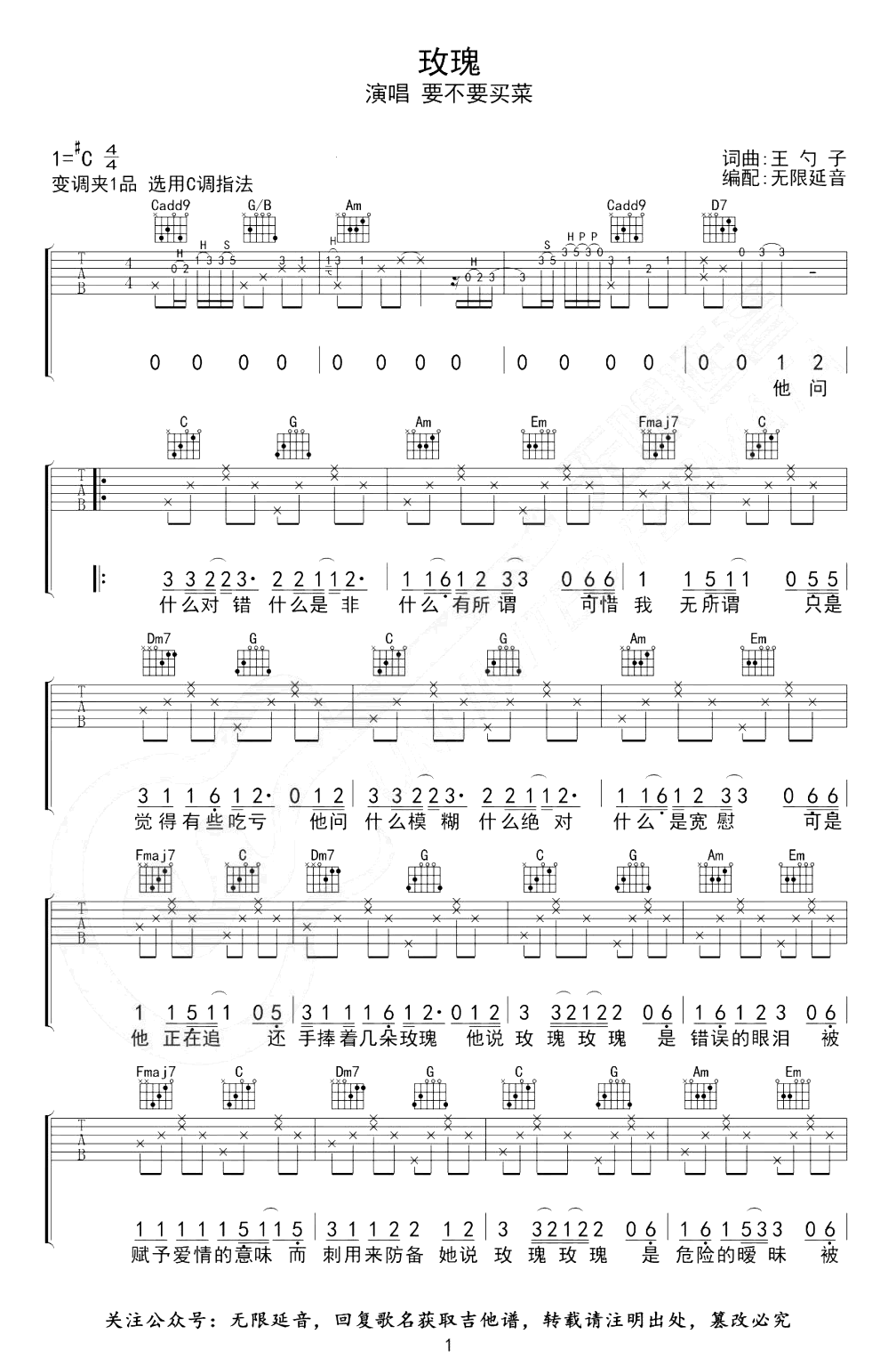 这首歌曲《玫瑰》以抖音热门歌曲而闻名,演唱者是才情横溢的“要不要买菜”,歌曲以原调升C的吉他弹唱六线谱为基础,选用C调指法,变调夹夹一品。歌曲以痞了吧唧的男声传递出无奈和深情,歌词表达了对心上人如同贫瘠土地上的唯一一朵玫瑰的珍视。图文混排中,两张图片谱展现了谱