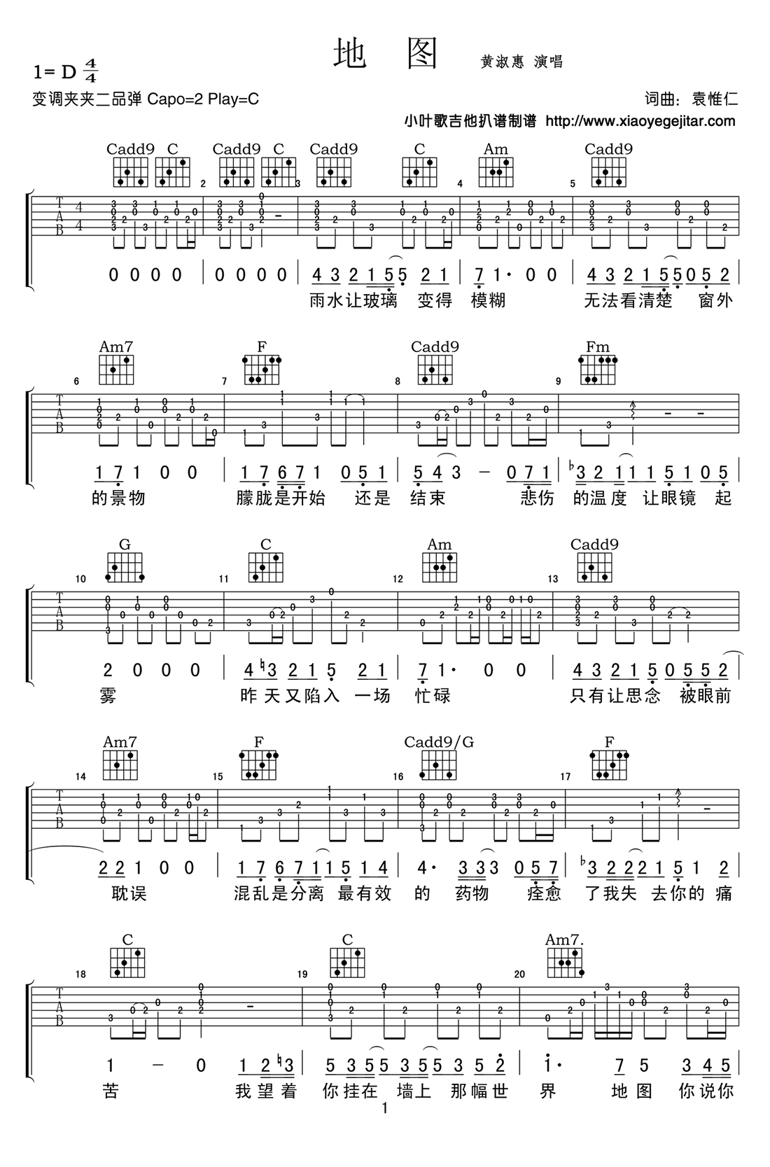 这是一首黄淑惠的老歌《地图》的吉他谱,以D调为原调,夹二品,采用C调指法,提供高清六线谱的图片。这首歌勾勒出春天的变幻莫测,让人忽远忽近,渴望旅行,却困于无法确定的假期。人生似乎也如此,不时与音乐的旋律脱节。在夜雨中,弹奏这曲的吉他,伴随着美丽女声,仿佛又回到