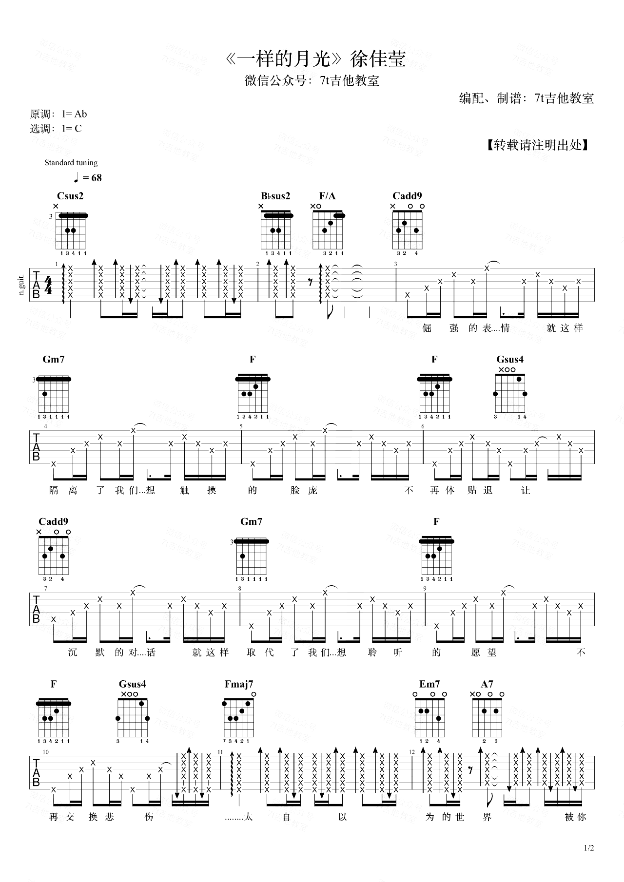 这是一首由徐佳莹演唱的吉他曲目,《一样的月光》原调为Ab大调,但谱子中采用了C大调的指法。在吉他弹唱视频中,演奏者采用了降半音调弦。值得注意的是,这谱子并不适合原调演奏。和弦编排简单实用,尤其运用了副属和弦的转换,如“A7 → Dm7”,以及曲末出现的四级小和