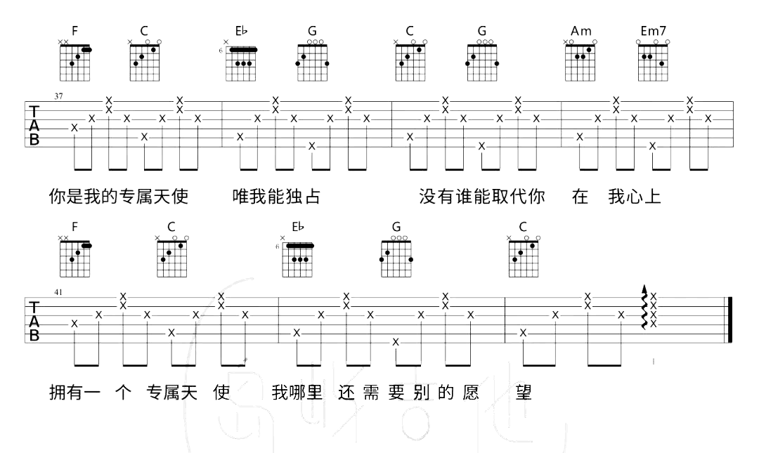 《TANK《专属天使吉他谱》(C调)》内容来自于互联网,不能保证内容的准确性与完整性,仅供学习交流欣赏,请勿用于其它用途,内容版权归原作者及来源网站所有,如有侵犯到您的权益请来信告知,我们将及时删除。