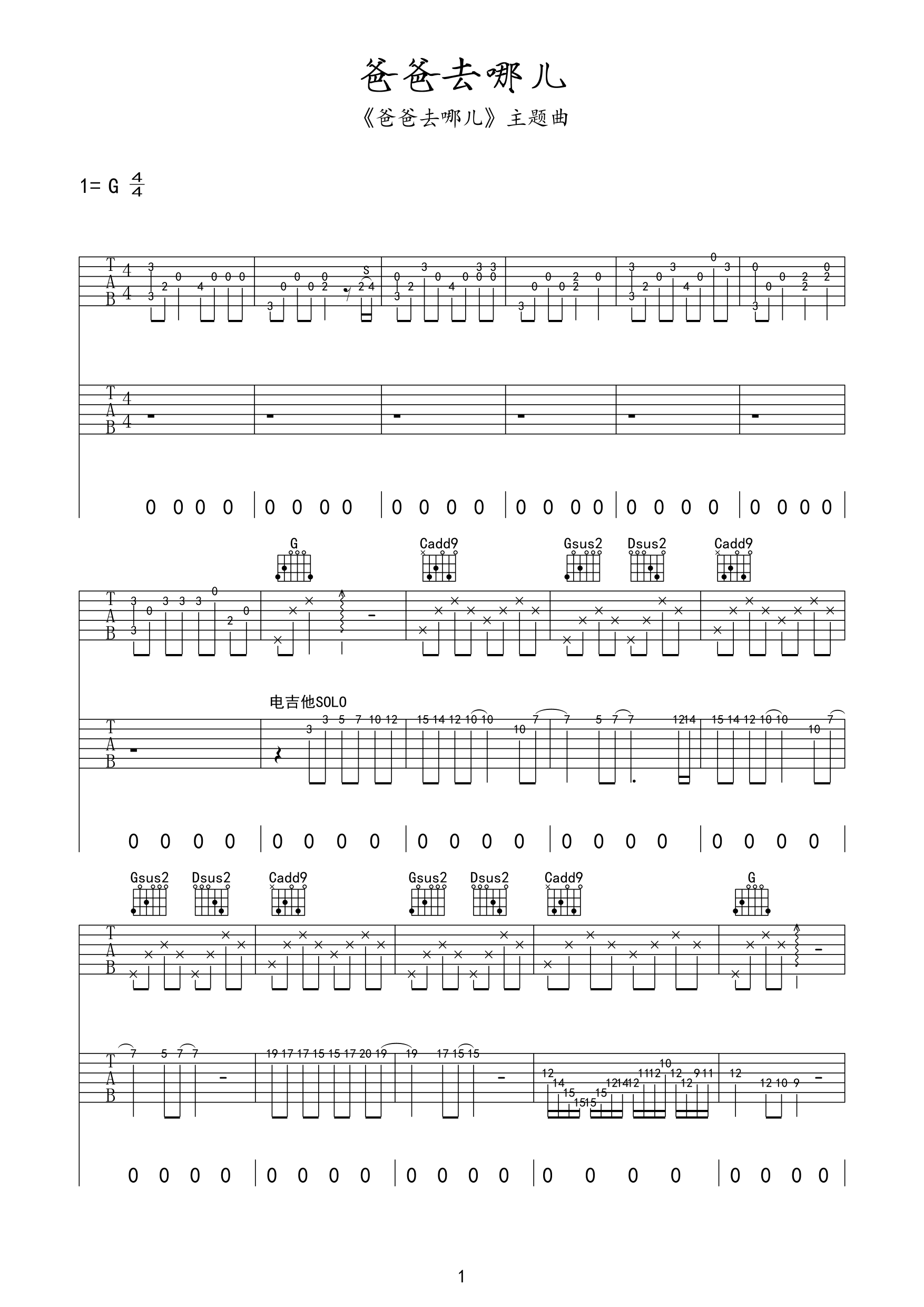 《曹格《爸爸去哪儿吉他谱》(G调)》内容来自于互联网,不能保证内容的准确性与完整性,仅供学习交流欣赏,请勿用于其它用途,内容版权归原作者及来源网站所有,如有侵犯到您的权益请来信告知,我们将及时删除。