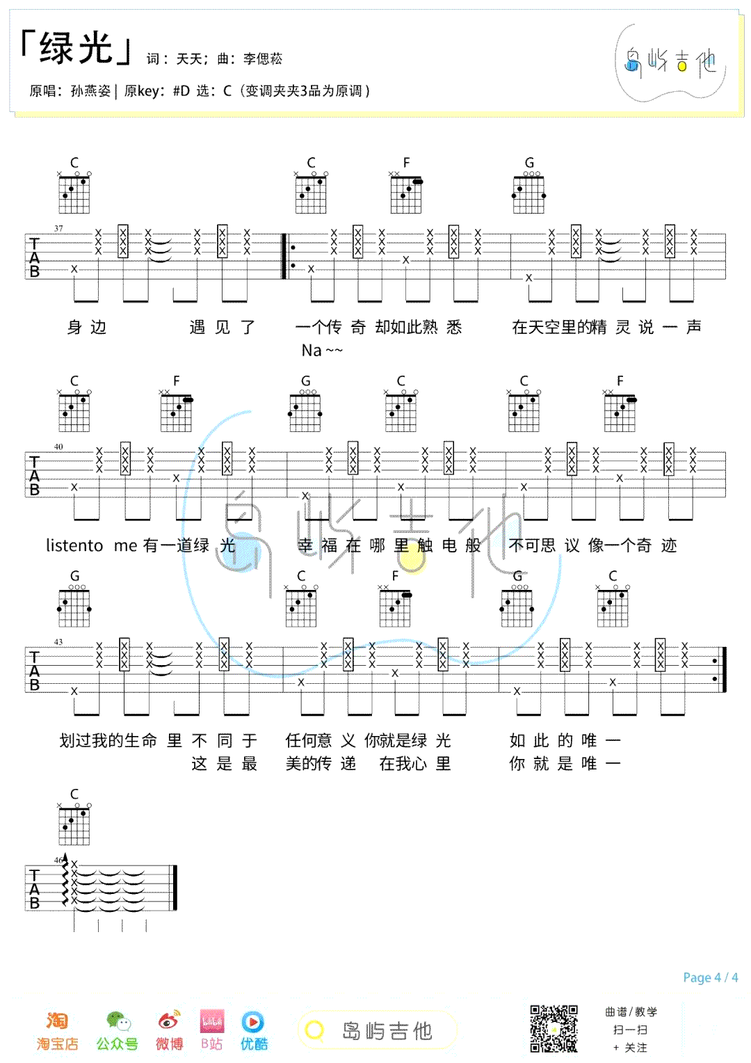《孙燕姿《绿光吉他谱》(C调)》内容来自于互联网,不能保证内容的准确性与完整性,仅供学习交流欣赏,请勿用于其它用途,内容版权归原作者及来源网站所有,如有侵犯到您的权益请来信告知,我们将及时删除。