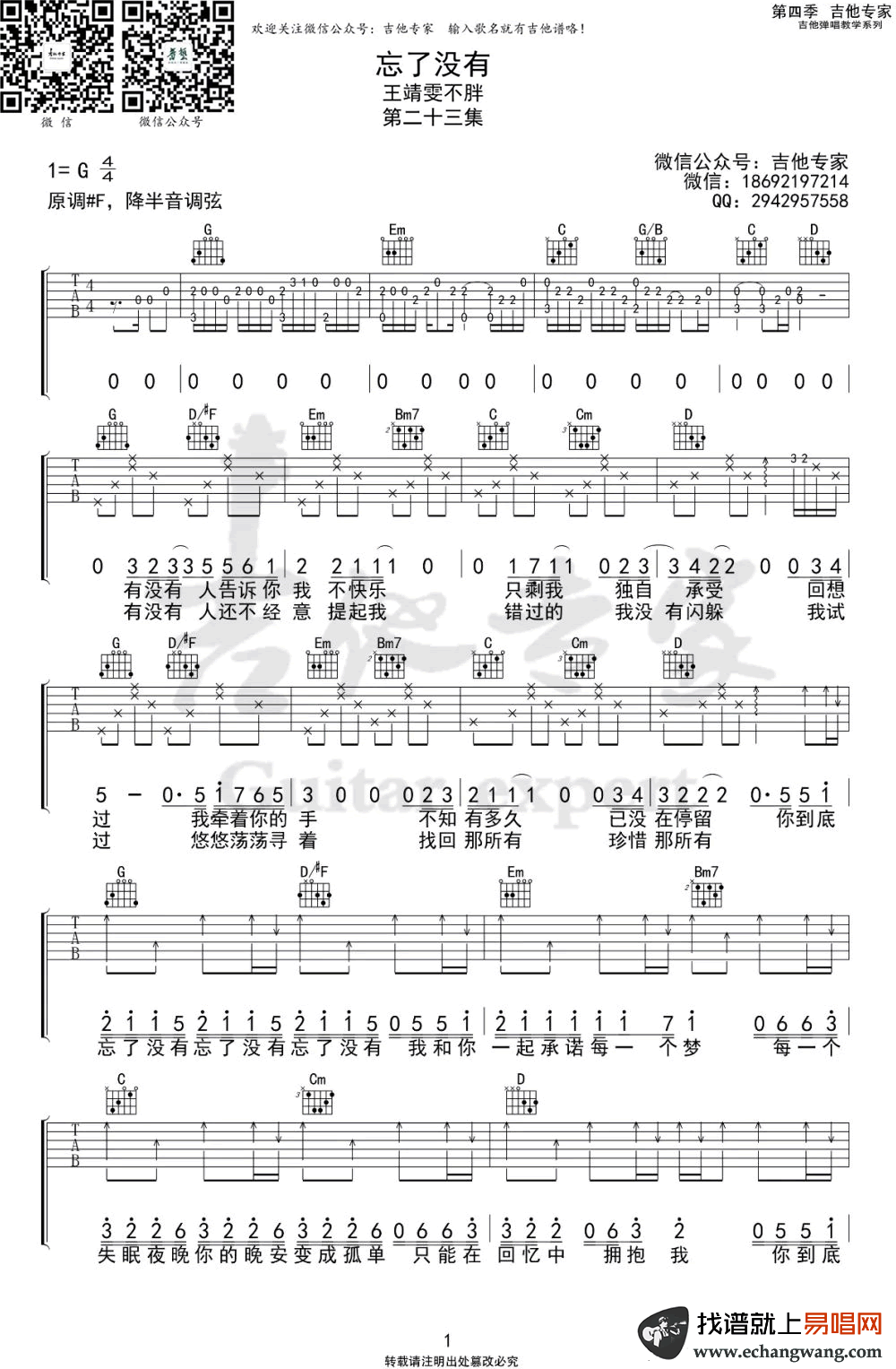 《王靖雯《忘了没有吉他谱》(G调)》内容来自于互联网,不能保证内容的准确性与完整性,仅供学习交流欣赏,请勿用于其它用途,内容版权归原作者及来源网站所有,如有侵犯到您的权益请来信告知,我们将及时删除。