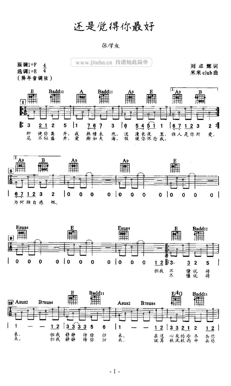 《张学友《还是觉得你最好吉他谱》》内容来自于互联网,不能保证内容的准确性与完整性,仅供学习交流欣赏,请勿用于其它用途,内容版权归原作者及来源网站所有,如有侵犯到您的权益请来信告知,我们将及时删除。